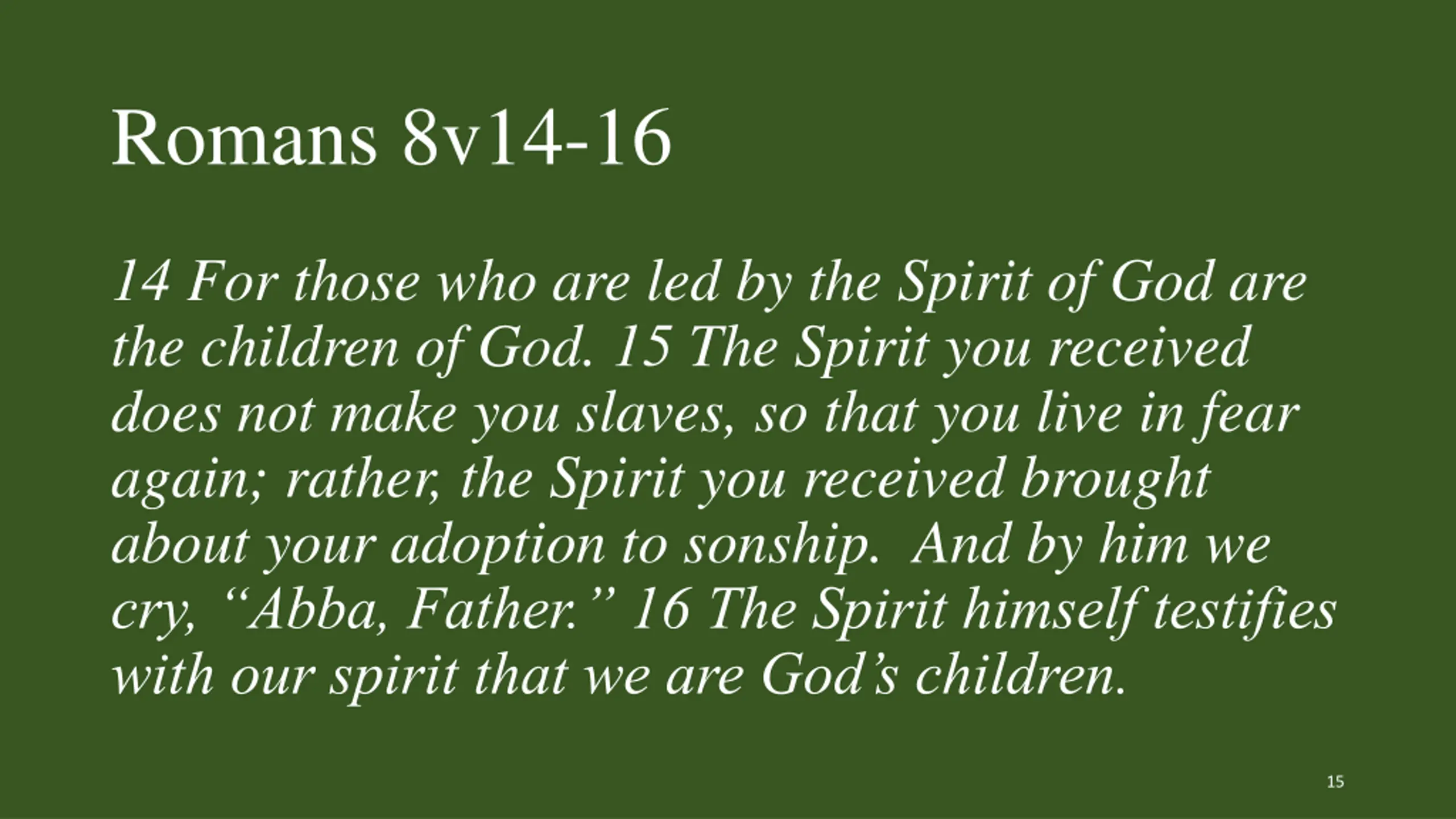 Romans 8v14-16 14 For those who are led by the Spirit of God are the children of God. 15 The Spirit you received does not make you slaves, so that you live in fear again; rather, the Spirit you received brought about your adoption to sonship. And by him we cry, Abba, Father. 16 The Spirit himself testifies with our spirit that we are God s children. 15