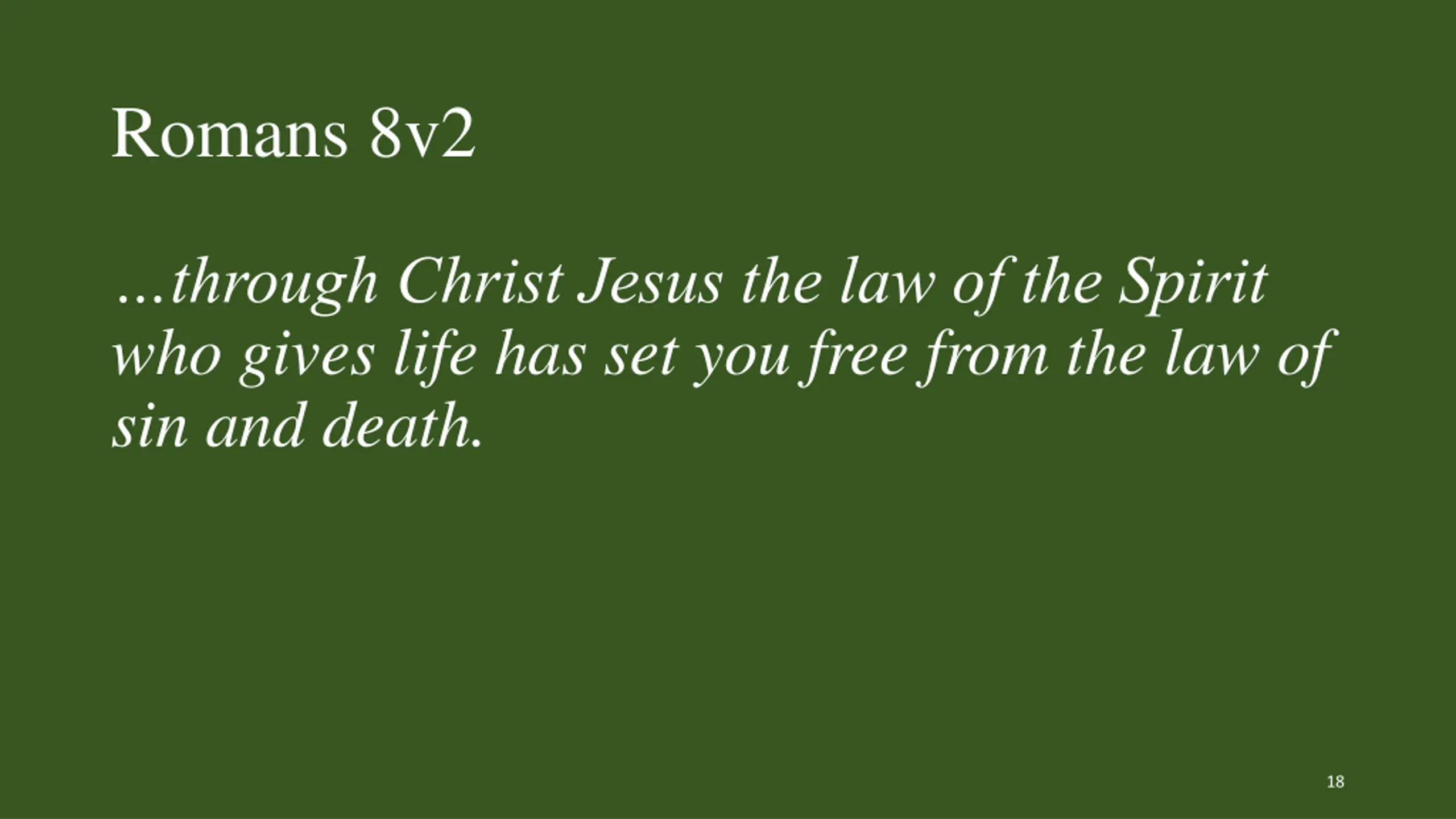 Romans 8v2 through Christ Jesus the law of the Spirit who gives life has set you free from the law of sin and death. 18