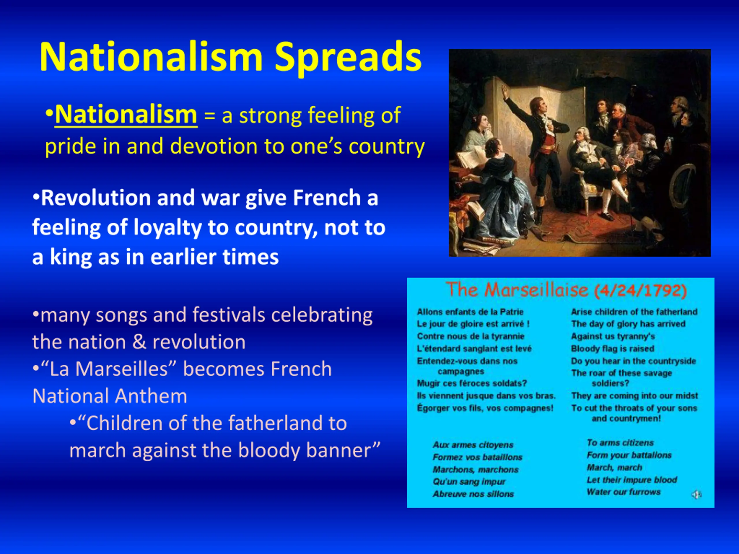 Nationalism Spreads Nationalism = a strong feeling of pride in and devotion to one s country Revolution and war give French a feeling of loyalty to country, not to a king as in earlier times many songs and festivals celebrating the nation & revolution La Marseilles becomes French National Anthem Children of the fatherland to march against the bloody banner