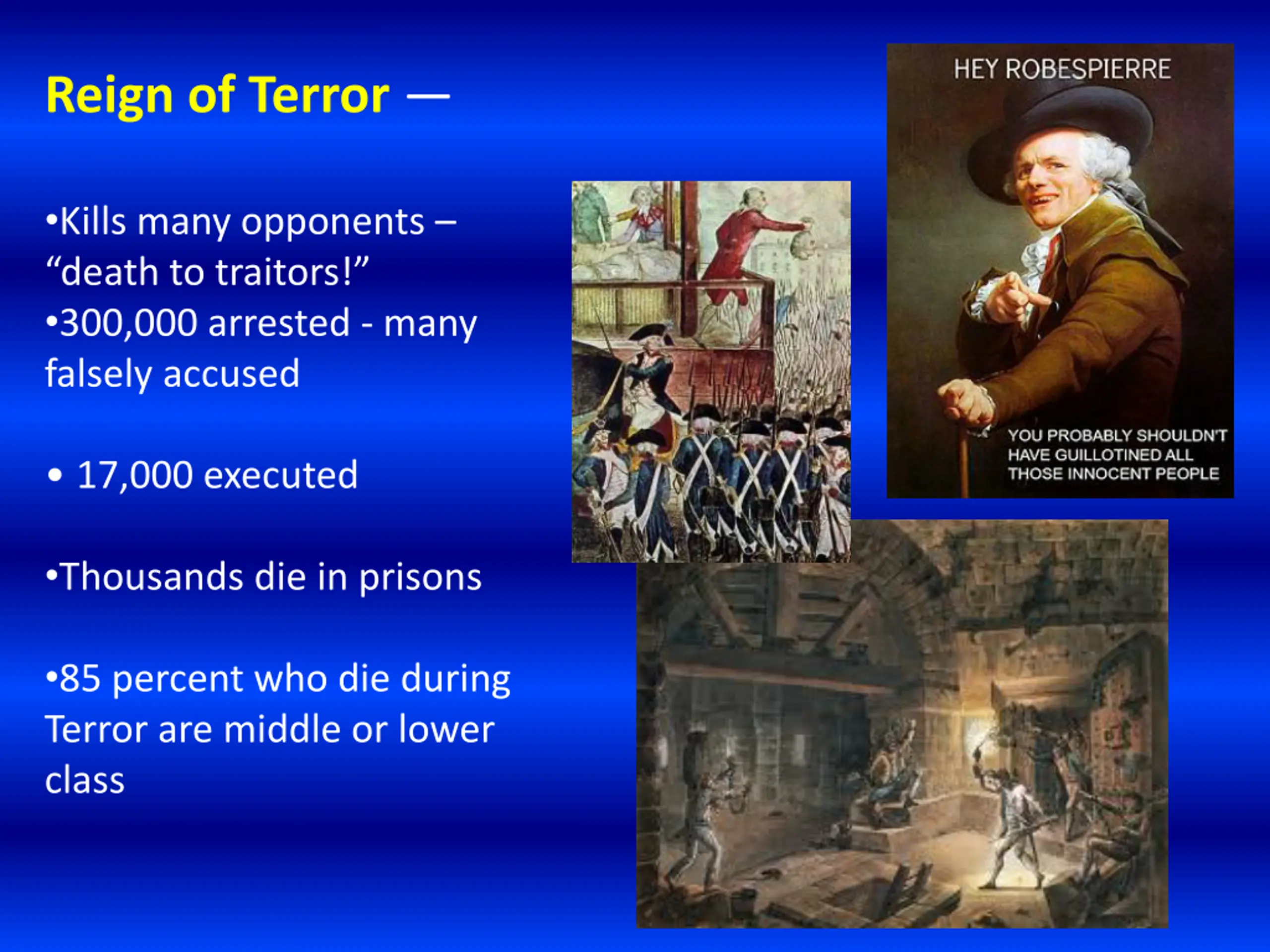 Reign of Terror Kills many opponents death to traitors! 300,000 arrested - many falsely accused 17,000 executed Thousands die in prisons 85 percent who die during Terror are middle or lower class