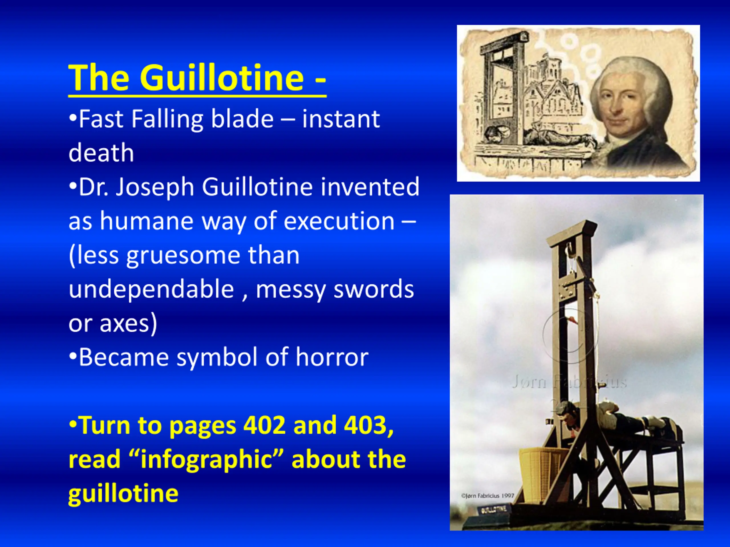 The Guillotine - Fast Falling blade instant death Dr. Joseph Guillotine invented as humane way of execution (less gruesome than undependable , messy swords or axes) Became symbol of horror Turn to pages 402 and 403, read infographic about the guillotine