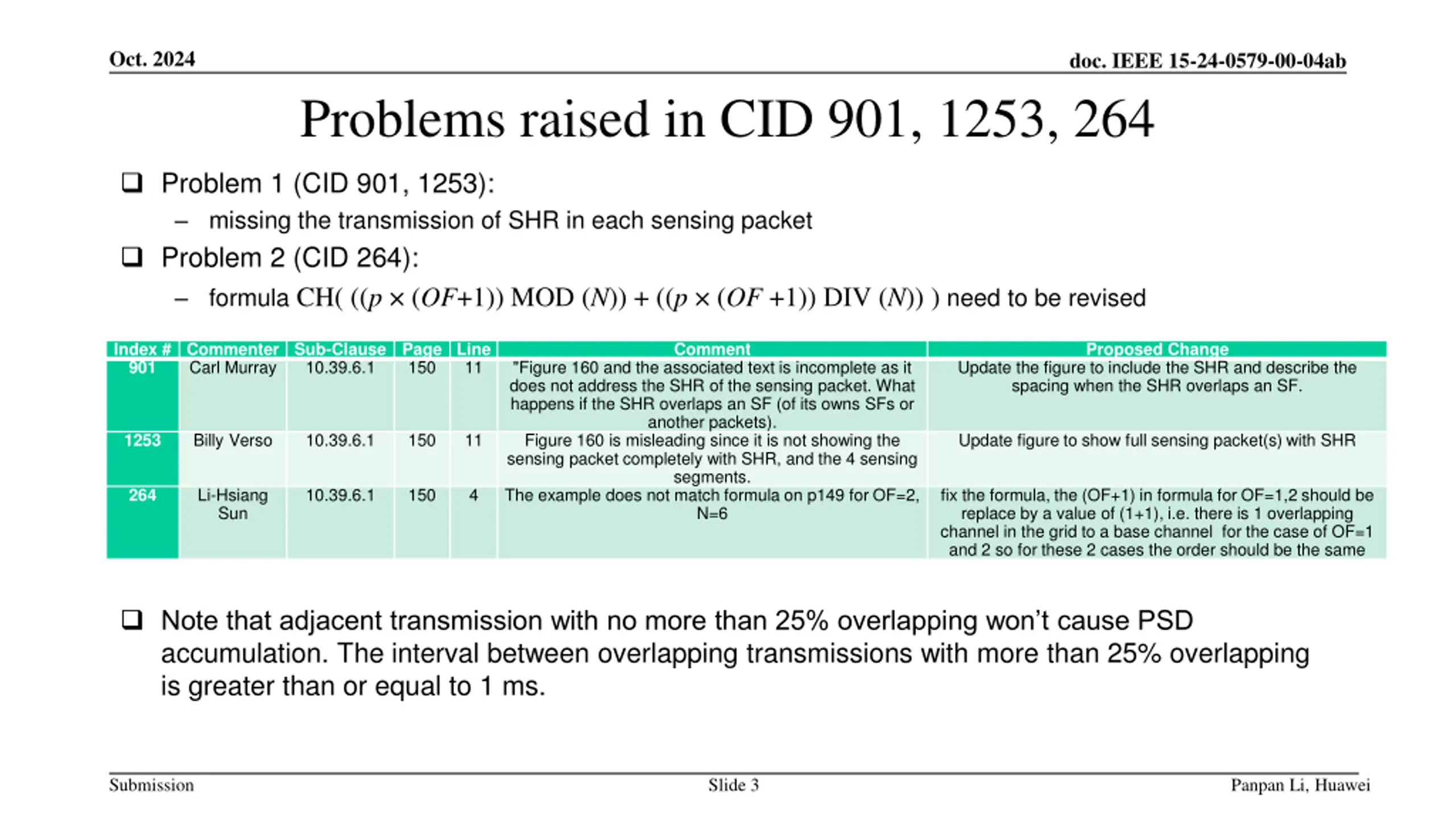 Oct. 2024 doc. IEEE 15-24-0579-00-04ab Problems raised in CID 901, 1253, 264 Problem 1 (CID 901, 1253): missing the transmission of SHR in each sensing packet Problem 2 (CID 264): formula CH( ((p (OF+1)) MOD (N)) + ((p (OF +1)) DIV (N)) ) need to be revised Index # Commenter 901 Carl Murray Sub-Clause 10.39.6.1 Page Line 150 Comment Proposed Change 11 "Figure 160 and the associated text is incomplete as it does not address the SHR of the sensing packet. What happens if the SHR overlaps an SF (of its owns SFs or another packets). Figure 160 is misleading since it is not showing the sensing packet completely with SHR, and the 4 sensing segments. The example does not match formula on p149 for OF=2, N=6 Update the figure to include the SHR and describe the spacing when the SHR overlaps an SF. Billy Verso 10.39.6.1 150 11 Update figure to show full sensing packet(s) with SHR 1253 Li-Hsiang Sun 10.39.6.1 150 4 fix the formula, the (OF+1) in formula for OF=1,2 should be replace by a value of (1+1), i.e. there is 1 overlapping channel in the grid to a base channel for the case of OF=1 and 2 so for these 2 cases the order should be the same 264 Note that adjacent transmission with no more than 25% overlapping won t cause PSD accumulation. The interval between overlapping transmissions with more than 25% overlapping is greater than or equal to 1 ms. Submission Slide 3 Panpan Li, Huawei