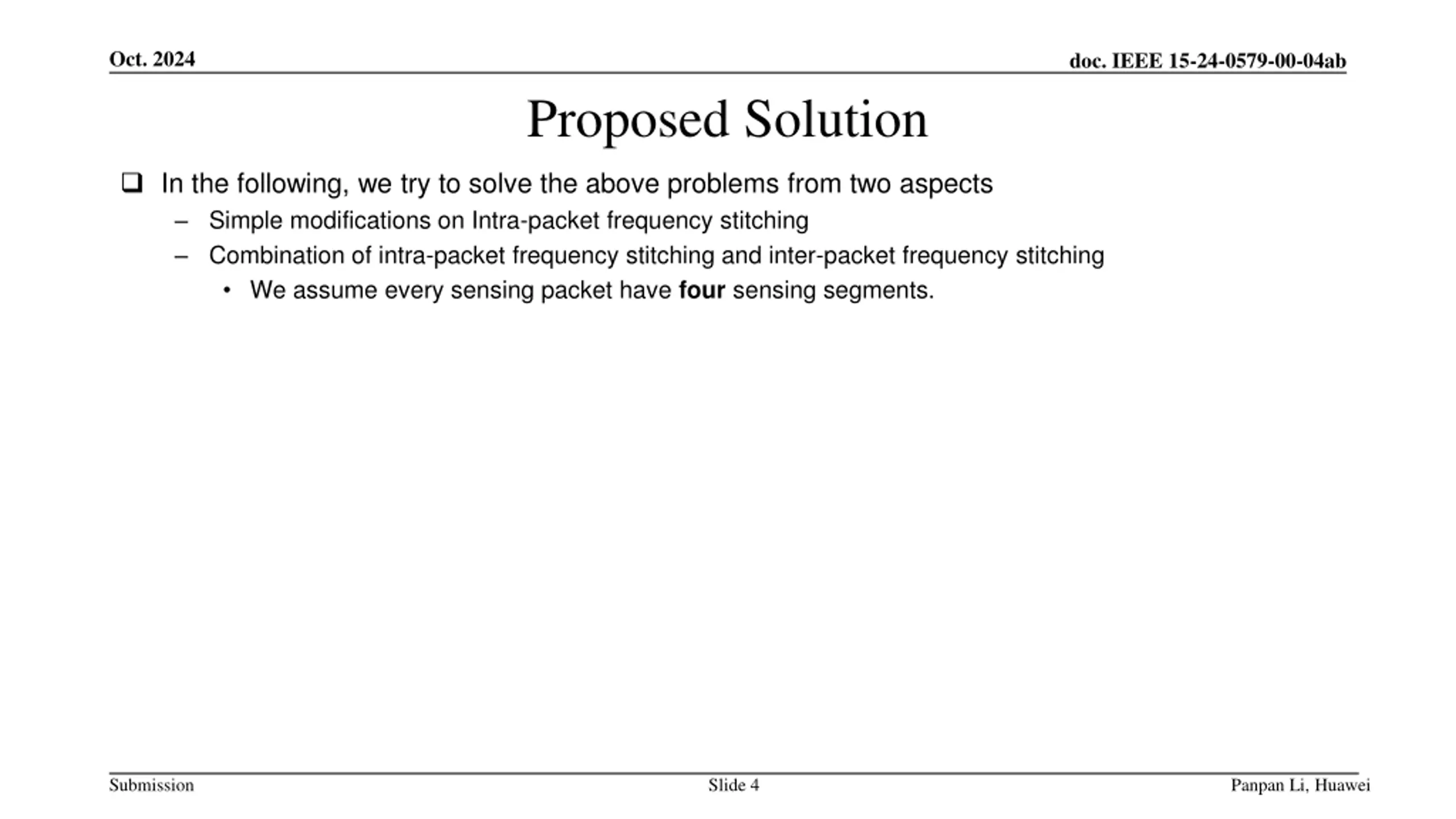 Oct. 2024 doc. IEEE 15-24-0579-00-04ab Proposed Solution In the following, we try to solve the above problems from two aspects Simple modifications on Intra-packet frequency stitching Combination of intra-packet frequency stitching and inter-packet frequency stitching We assume every sensing packet have four sensing segments. Submission Slide 4 Panpan Li, Huawei