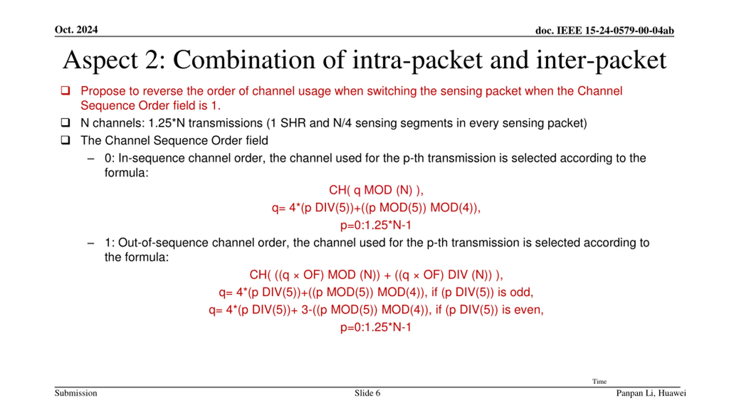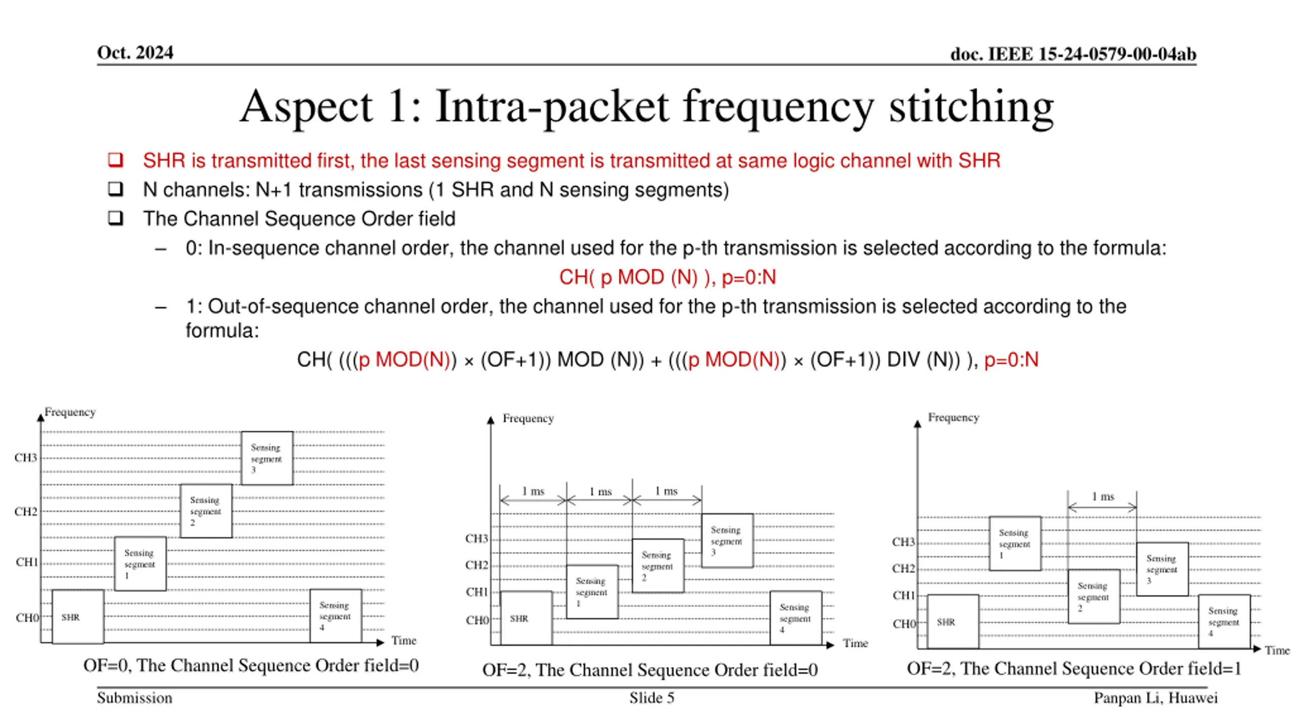 Oct. 2024 doc. IEEE 15-24-0579-00-04ab Aspect 1: Intra-packet frequency stitching SHR is transmitted first, the last sensing segment is transmitted at same logic channel with SHR N channels: N+1 transmissions (1 SHR and N sensing segments) The Channel Sequence Order field 0: In-sequence channel order, the channel used for the p-th transmission is selected according to the formula: CH( p MOD (N) ), p=0:N 1: Out-of-sequence channel order, the channel used for the p-th transmission is selected according to the formula: CH( (((p MOD(N)) (OF+1)) MOD (N)) + (((p MOD(N)) (OF+1)) DIV (N)) ), p=0:N Frequency Frequency Frequency Sensing segment 3 CH3 1 ms 1 ms 1 ms 1 ms Sensing segment 2 CH2 Sensing segment 3 Sensing segment 1 CH3 CH3 Sensing segment 1 Sensing segment 2 Sensing segment 3 CH1 CH2 CH2 Sensing segment 1 Sensing segment 2 CH1 CH1 Sensing segment 4 Sensing segment 4 Sensing segment 4 CH0 SHR SHR CH0 SHR CH0 Time Time Time OF=0, The Channel Sequence Order field=0 OF=2, The Channel Sequence Order field=1 OF=2, The Channel Sequence Order field=0 Submission Slide 5 Panpan Li, Huawei