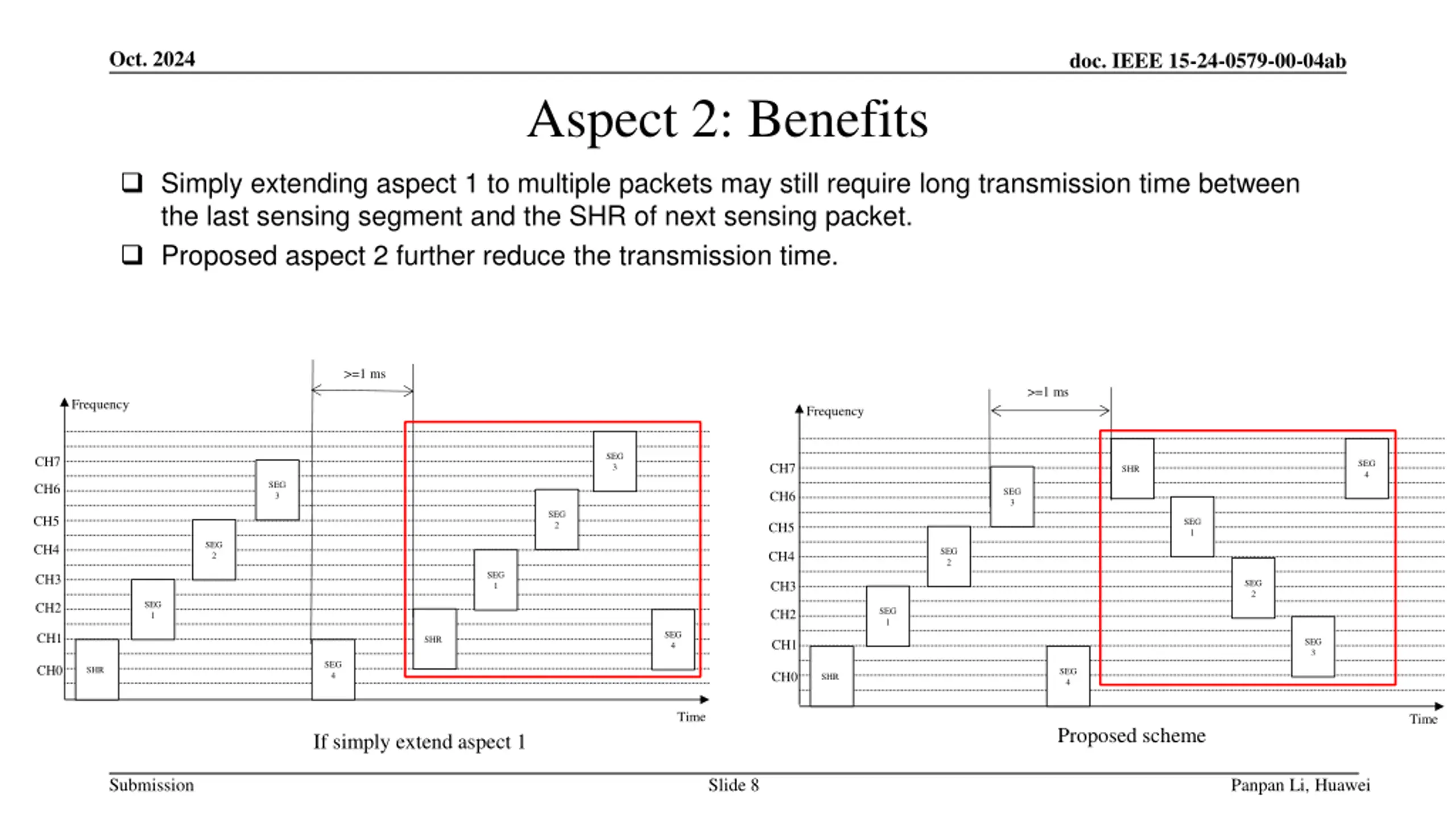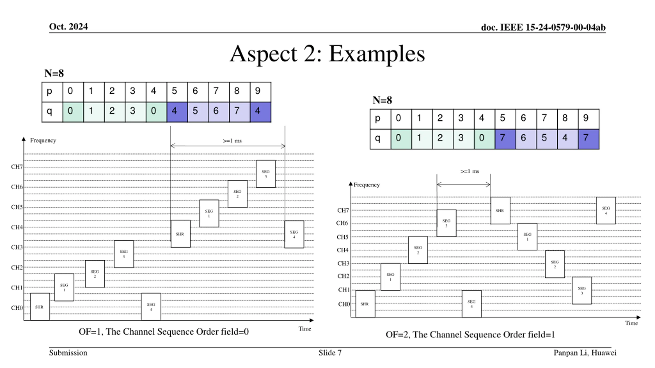 Oct. 2024 doc. IEEE 15-24-0579-00-04ab Aspect 2: Examples N=8 p 0 1 2 3 4 5 6 7 8 9 N=8 q 0 1 2 3 0 4 5 6 7 4 p 0 1 2 3 4 5 6 7 8 9 q 0 1 2 3 0 7 6 5 4 7 Frequency >=1 ms CH7 >=1 ms SEG 3 Frequency CH6 SEG 2 CH5 SEG 4 CH7 SHR SEG 1 SEG 3 CH6 CH4 SEG 4 SHR SEG 1 CH5 CH3 SEG 2 CH4 SEG 3 SEG 2 CH3 CH2 SEG 2 SEG 1 CH2 SEG 1 CH1 SEG 3 CH1 SEG 4 CH0 SHR SEG 4 CH0 SHR Time Time OF=1, The Channel Sequence Order field=0 OF=2, The Channel Sequence Order field=1 Submission Slide 7 Panpan Li, Huawei