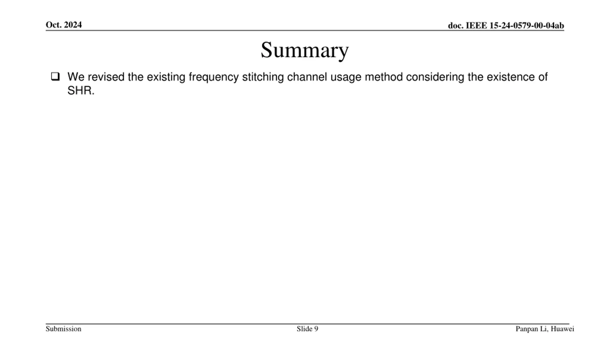 Oct. 2024 doc. IEEE 15-24-0579-00-04ab Summary We revised the existing frequency stitching channel usage method considering the existence of SHR. Submission Slide 9 Panpan Li, Huawei