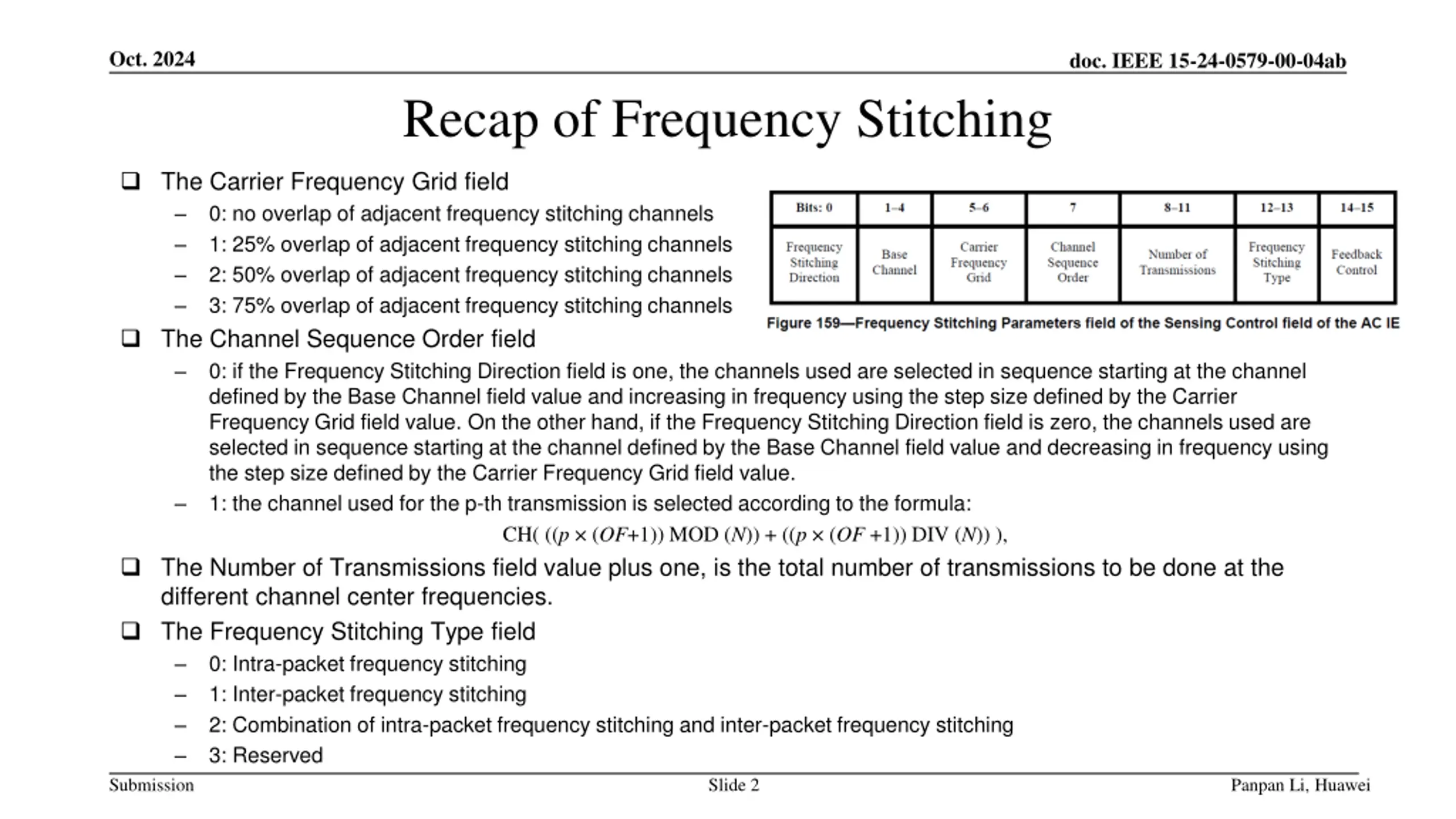 Oct. 2024 doc. IEEE 15-24-0579-00-04ab Recap of Frequency Stitching The Carrier Frequency Grid field 0: no overlap of adjacent frequency stitching channels 1: 25% overlap of adjacent frequency stitching channels 2: 50% overlap of adjacent frequency stitching channels 3: 75% overlap of adjacent frequency stitching channels The Channel Sequence Order field 0: if the Frequency Stitching Direction field is one, the channels used are selected in sequence starting at the channel defined by the Base Channel field value and increasing in frequency using the step size defined by the Carrier Frequency Grid field value. On the other hand, if the Frequency Stitching Direction field is zero, the channels used are selected in sequence starting at the channel defined by the Base Channel field value and decreasing in frequency using the step size defined by the Carrier Frequency Grid field value. 1: the channel used for the p-th transmission is selected according to the formula: CH( ((p (OF+1)) MOD (N)) + ((p (OF +1)) DIV (N)) ), The Number of Transmissions field value plus one, is the total number of transmissions to be done at the different channel center frequencies. The Frequency Stitching Type field 0: Intra-packet frequency stitching 1: Inter-packet frequency stitching 2: Combination of intra-packet frequency stitching and inter-packet frequency stitching 3: Reserved Slide 2 Submission Panpan Li, Huawei