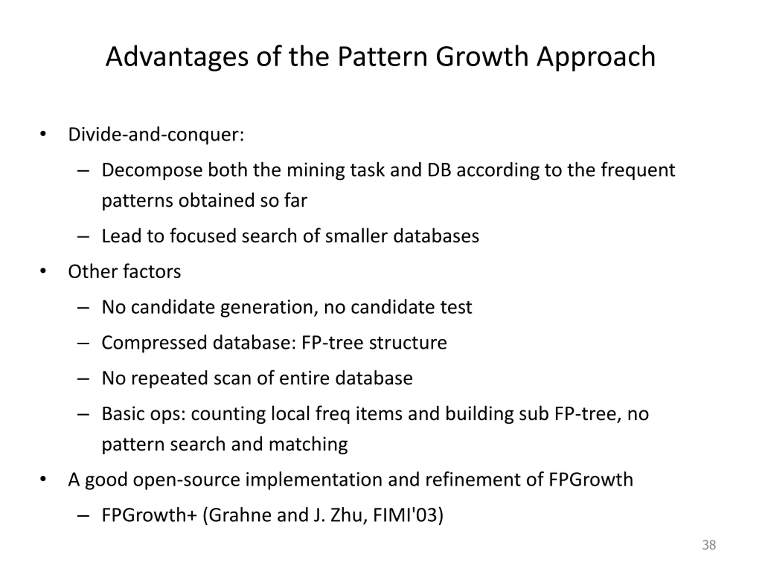 Advantages of the Pattern Growth Approach Divide-and-conquer: Decompose both the mining task and DB according to the frequent patterns obtained so far Lead to focused search of smaller databases Other factors No candidate generation, no candidate test Compressed database: FP-tree structure No repeated scan of entire database Basic ops: counting local freq items and building sub FP-tree, no pattern search and matching A good open-source implementation and refinement of FPGrowth FPGrowth+ (Grahne and J. Zhu, FIMI'03) 38