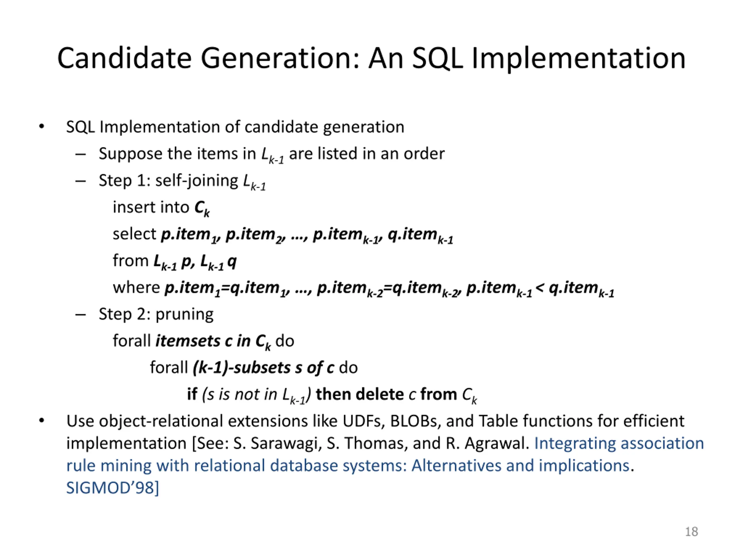 Candidate Generation: An SQL Implementation SQL Implementation of candidate generation Suppose the items in Lk-1 are listed in an order Step 1: self-joining Lk-1 insert intoCk select p.item1, p.item2, , p.itemk-1, q.itemk-1 from Lk-1 p, Lk-1 q where p.item1=q.item1, , p.itemk-2=q.itemk-2, p.itemk-1 < q.itemk-1 Step 2: pruning forall itemsets c in Ckdo forall (k-1)-subsets s of c do if (s is not in Lk-1) then delete c from Ck Use object-relational extensions like UDFs, BLOBs, and Table functions for efficient implementation [See: S. Sarawagi, S. Thomas, and R. Agrawal. Integrating association rule mining with relational database systems: Alternatives and implications. SIGMOD 98] 18