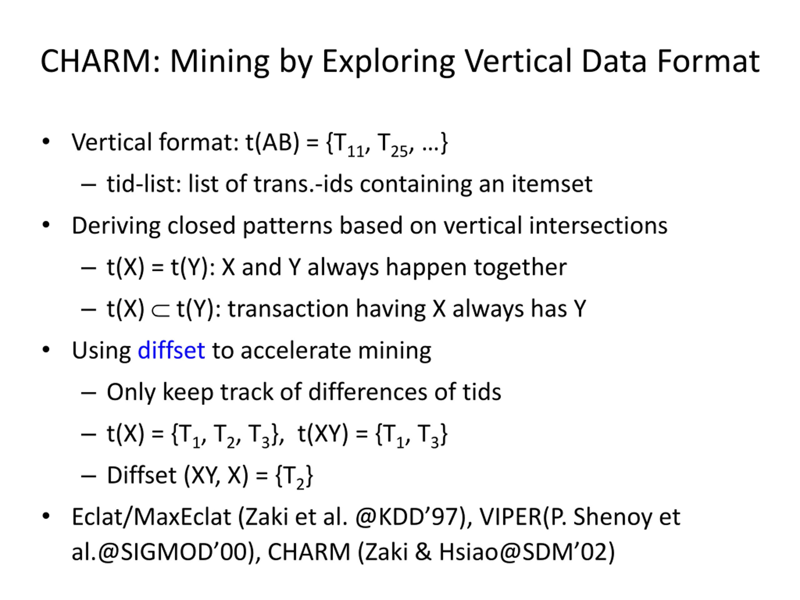 CHARM: Mining by Exploring Vertical Data Format Vertical format: t(AB) = {T11, T25, } tid-list: list of trans.-ids containing an itemset Deriving closed patterns based on vertical intersections t(X) = t(Y): X and Y always happen together t(X) t(Y): transaction having X always has Y Using diffset to accelerate mining Only keep track of differences of tids t(X) = {T1, T2, T3}, t(XY) = {T1, T3} Diffset (XY, X) = {T2} Eclat/MaxEclat (Zaki et al. @KDD 97), VIPER(P. Shenoy et al.@SIGMOD 00), CHARM (Zaki & Hsiao@SDM 02)