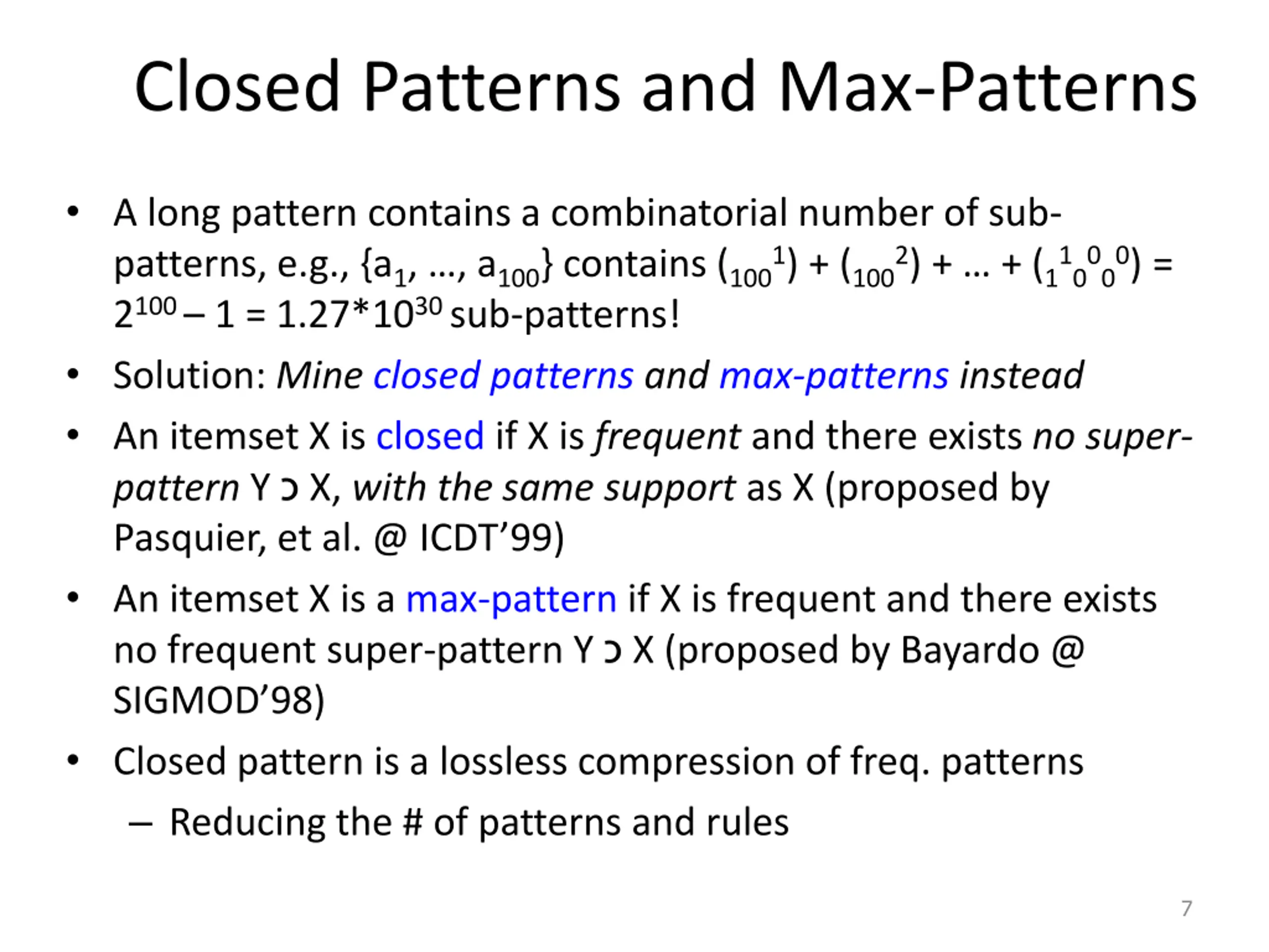 Closed Patterns and Max-Patterns Exercise. DB = {<a1, , a100>, < a1, , a50>} Min_sup = 1. What is the set of closed itemset? <a1, , a100>: 1 < a1, , a50>: 2 What is the set of max-pattern? <a1, , a100>: 1 What is the set of all patterns? !! 8