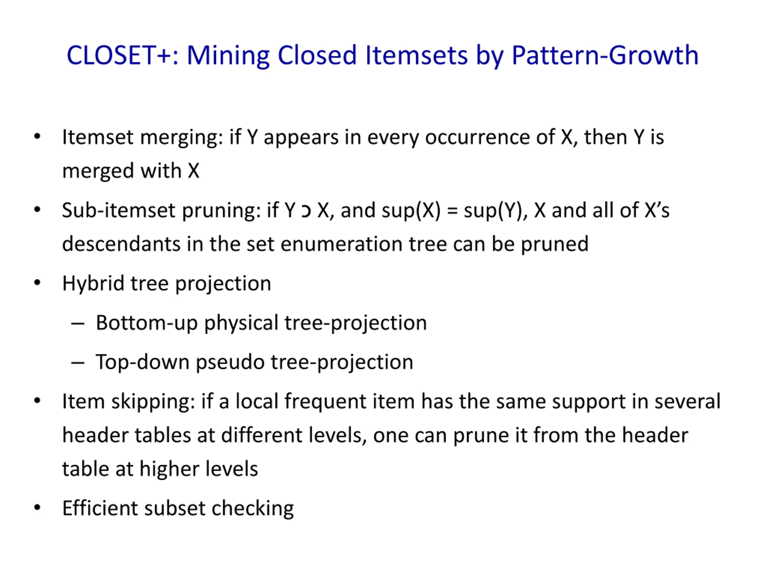 CLOSET+: Mining Closed Itemsets by Pattern-Growth Itemset merging: if Y appears in every occurrence of X, then Y is merged with X Sub-itemset pruning: if Y X, and sup(X) = sup(Y), X and all of X s descendants in the set enumeration tree can be pruned Hybrid tree projection Bottom-up physical tree-projection Top-down pseudo tree-projection Item skipping: if a local frequent item has the same support in several header tables at different levels, one can prune it from the header table at higher levels Efficient subset checking