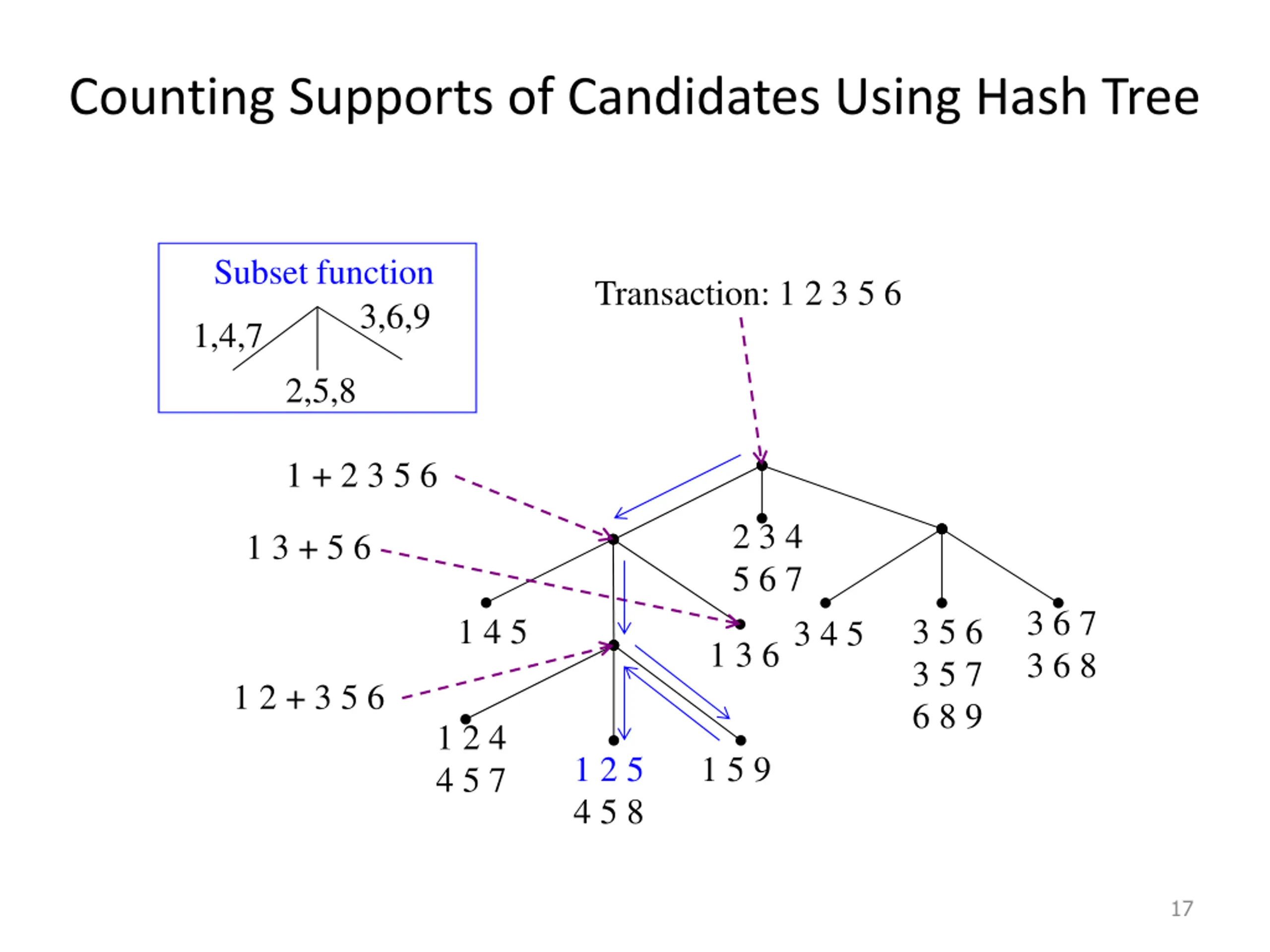 How to Count Supports of Candidates? Why counting supports of candidates a problem? The total number of candidates can be very huge One transaction may contain many candidates Method: Candidate itemsets are stored in a hash-tree Leaf node of hash-tree contains a list of itemsets and counts Interior node contains a hash table Subset function: finds all the candidates contained in a transaction 16