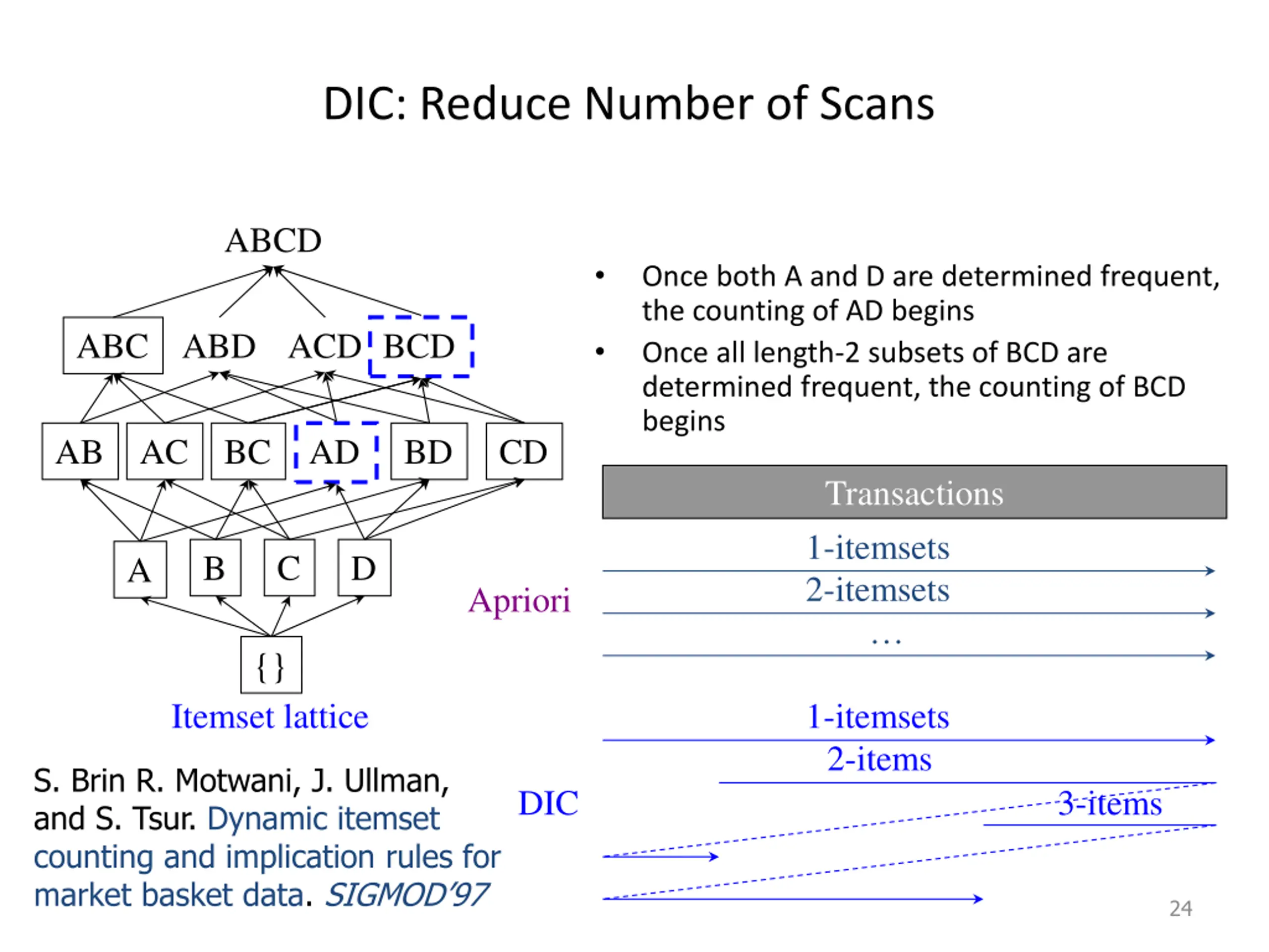 Sampling for Frequent Patterns Select a sample of original database, mine frequent patterns within sample using Apriori Scan database once to verify frequent itemsets found in sample, only borders of closure of frequent patterns are checked Example: check abcd instead of ab, ac, , etc. Scan database again to find missed frequent patterns H. Toivonen. Sampling large databases for association rules. In VLDB 96 23