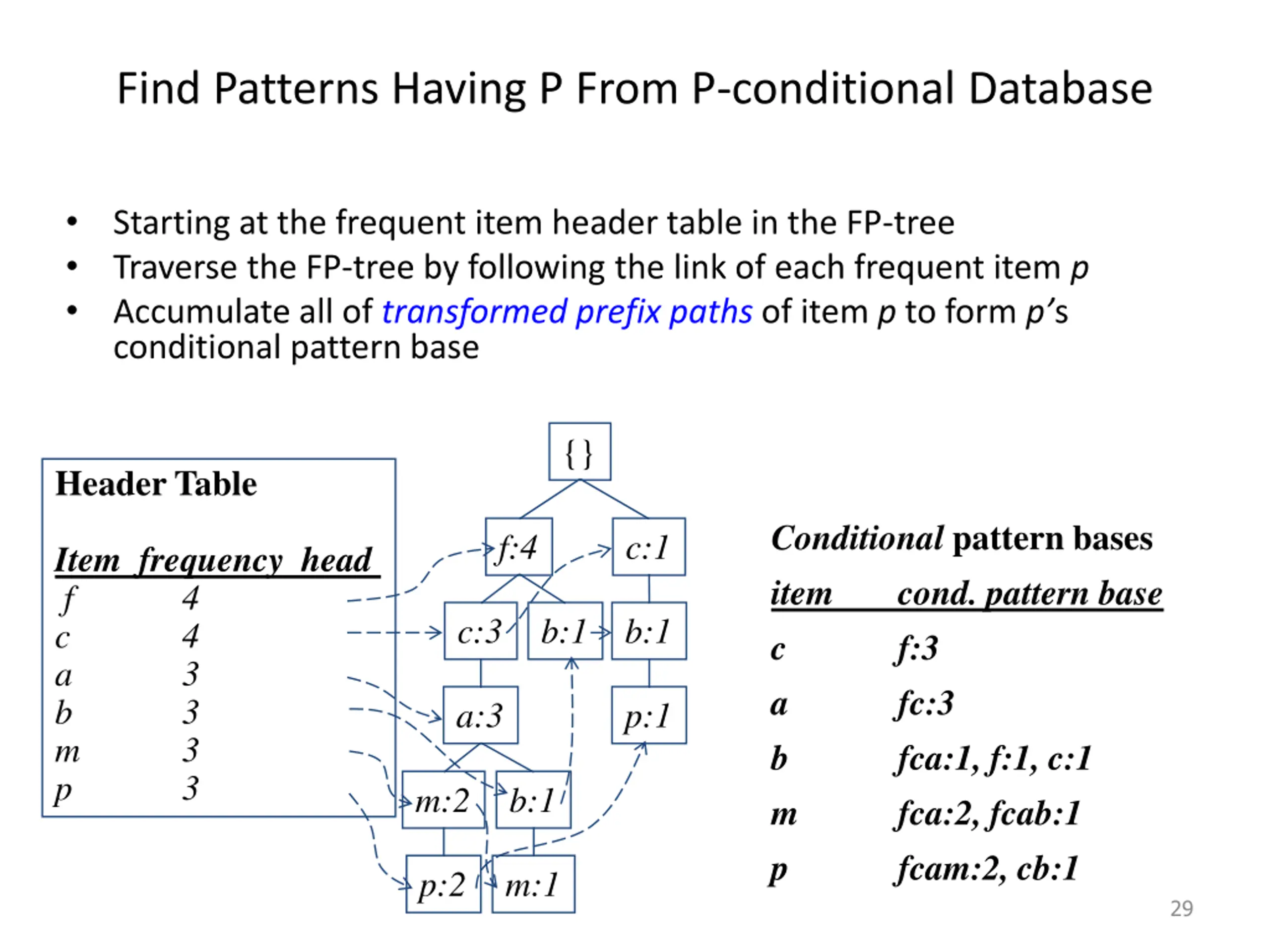 Partition Patterns and Databases Frequent patterns can be partitioned into subsets according to f-list F-list = f-c-a-b-m-p Patterns containing p Patterns having m but no p Patterns having c but no a nor b, m, p Pattern f Completeness and non-redundency 28