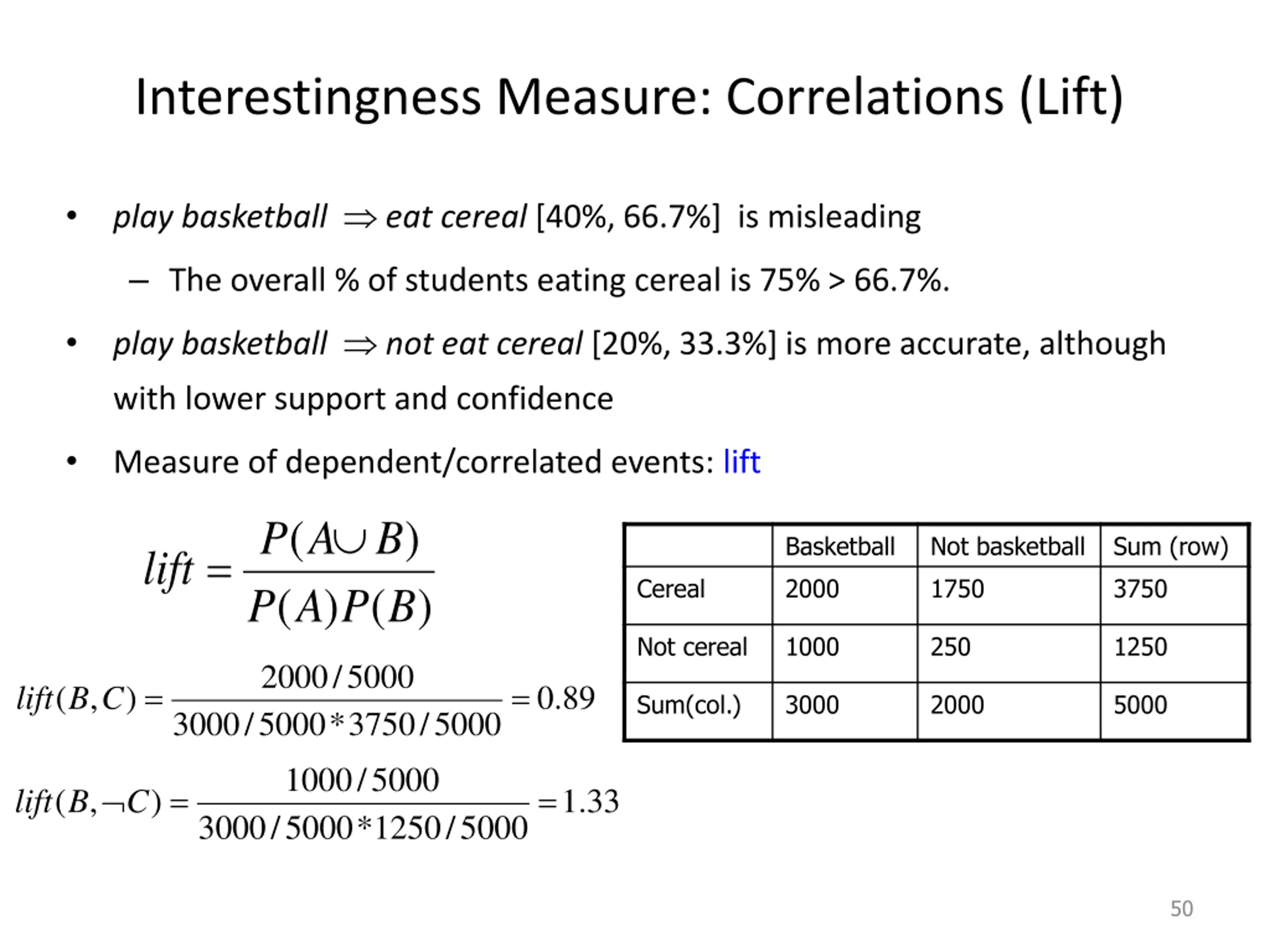 Interestingness Measure: Correlations (Lift) play basketball eat cereal [40%, 66.7%] is misleading The overall % of students eating cereal is 75% > 66.7%. play basketball not eat cereal [20%, 33.3%] is more accurate, although with lower support and confidence Measure of dependent/correlated events: lift ( A ) P A B Basketball Not basketball Sum (row) = lift Cereal 2000 1750 3750 ( ) ( ) P P B Not cereal 1000 250 1250 2000 / 5000 = = ( , ) . 0 89 lift B C Sum(col.) 3000 2000 5000 3000 / 5000 * 3750 / 5000 1000 / 5000 C = . 1 = ( , ) 33 lift B 3000 / 5000 1250 * / 5000 50