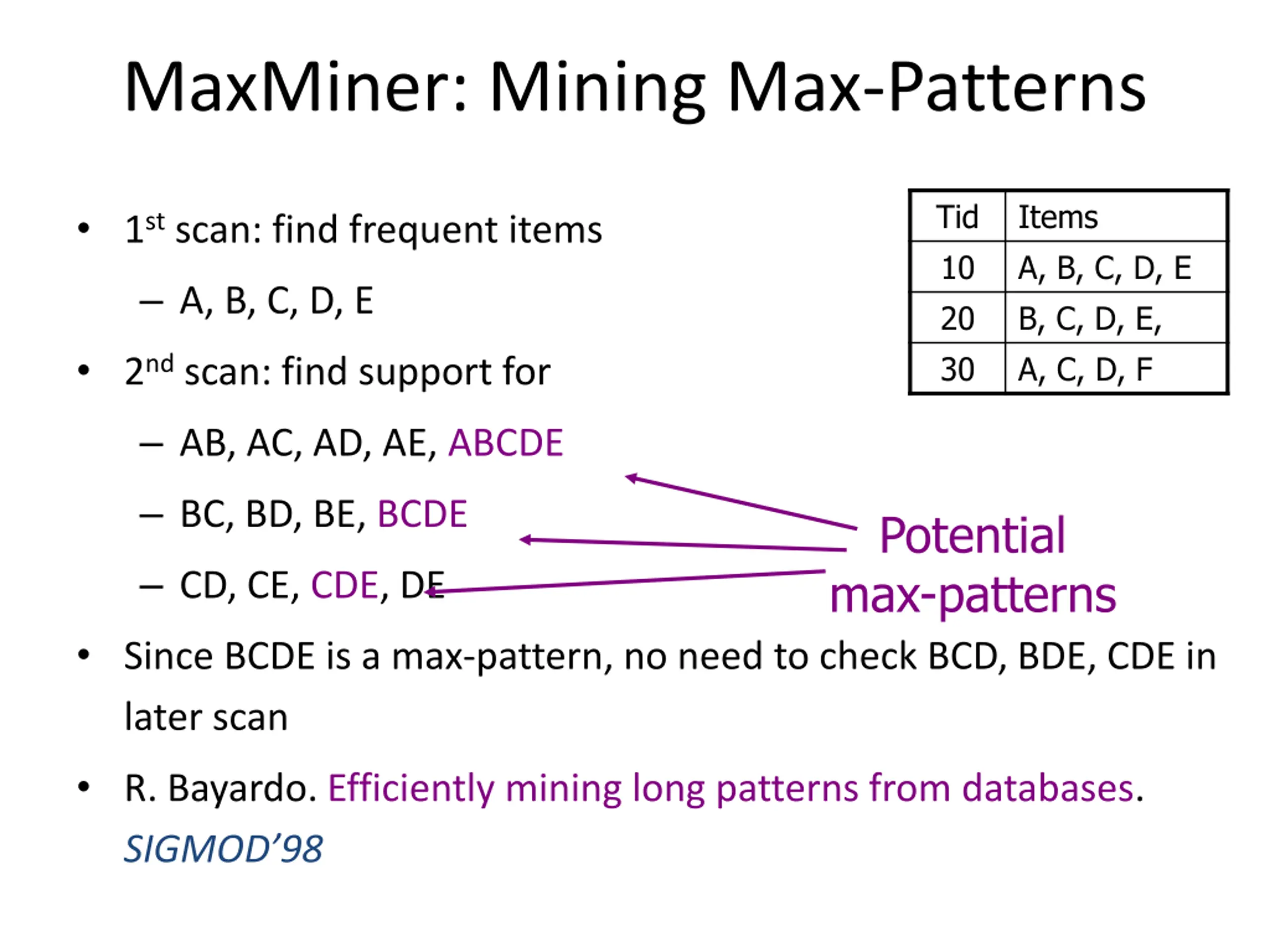 MaxMiner: Mining Max-Patterns Tid 10 20 30 Items A, B, C, D, E B, C, D, E, A, C, D, F 1st scan: find frequent items A, B, C, D, E 2nd scan: find support for AB, AC, AD, AE, ABCDE BC, BD, BE, BCDE Potential max-patterns CD, CE, CDE, DE Since BCDE is a max-pattern, no need to check BCD, BDE, CDE in later scan R. Bayardo. Efficiently mining long patterns from databases. SIGMOD 98