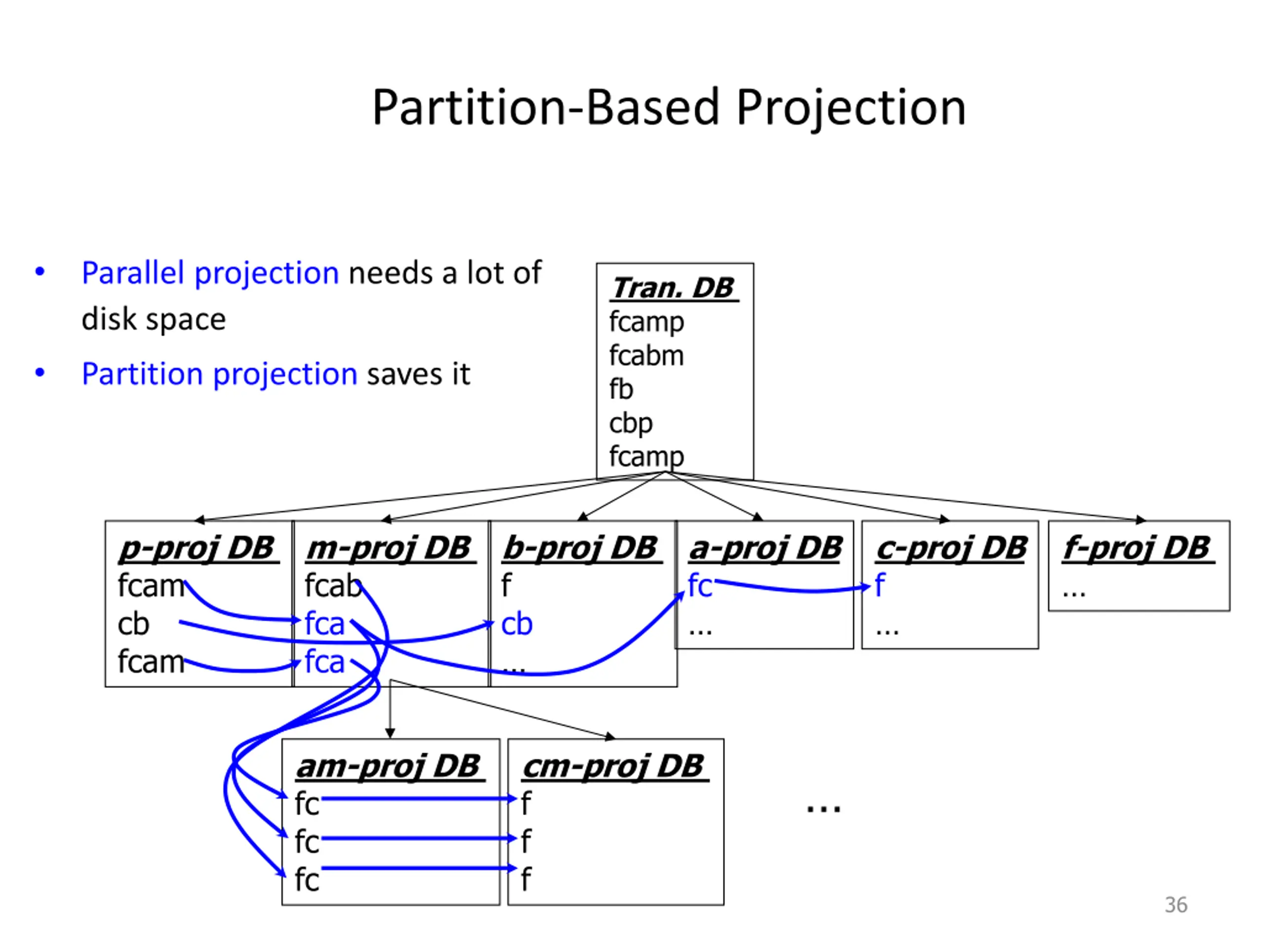 Partition-Based Projection Parallel projection needs a lot of disk space Tran. DB fcamp fcabm fb cbp fcamp Partition projection saves it p-proj DB fcam cb fcam m-proj DB fcab fca fca b-proj DB f cb a-proj DB fc c-proj DB f f-proj DB am-proj DB fc fc fc cm-proj DB f f f 36