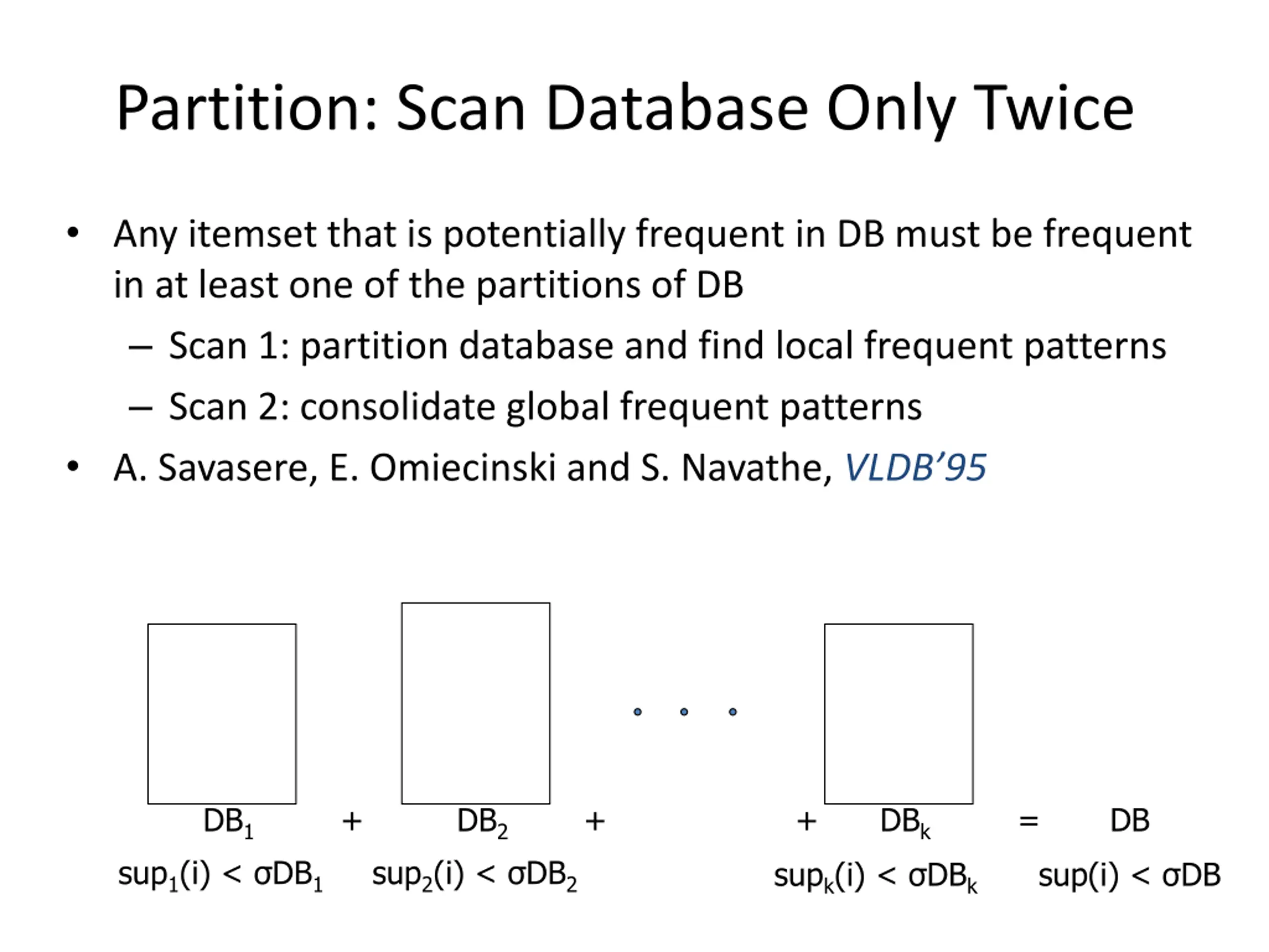 Partition: Scan Database Only Twice Any itemset that is potentially frequent in DB must be frequent in at least one of the partitions of DB Scan 1: partition database and find local frequent patterns Scan 2: consolidate global frequent patterns A. Savasere, E. Omiecinski and S. Navathe, VLDB 95 DB1 + DB2 + + DBk = DB sup1(i) < DB1 sup2(i) < DB2 supk(i) < DBk sup(i) < DB