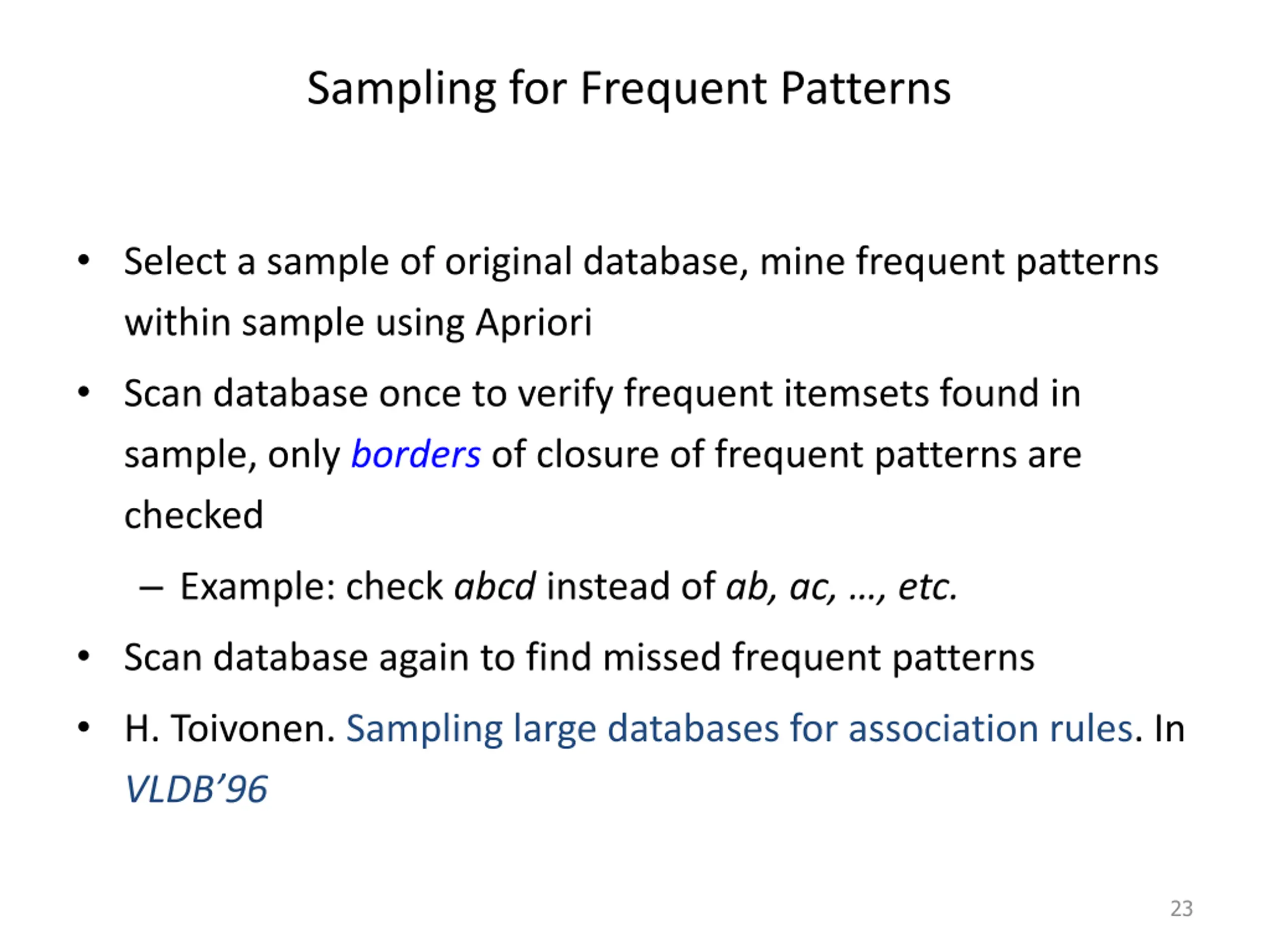 DHP: Reduce the Number of Candidates A k-itemset whose corresponding hashing bucket count is below the threshold cannot be frequent count itemsets Candidates: a, b, c, d, e {ab, ad, ae} {bd, be, de} 35 88 Hash entries {ab, ad, ae} . . . {bd, be, de} . . . 102 {yz, qs, wt} Hash Table Frequent 1-itemset: a, b, d, e ab is not a candidate 2-itemset if the sum of count of {ab, ad, ae} is below support threshold J. Park, M. Chen, and P. Yu. An effective hash-based algorithm for mining association rules. SIGMOD 95 22