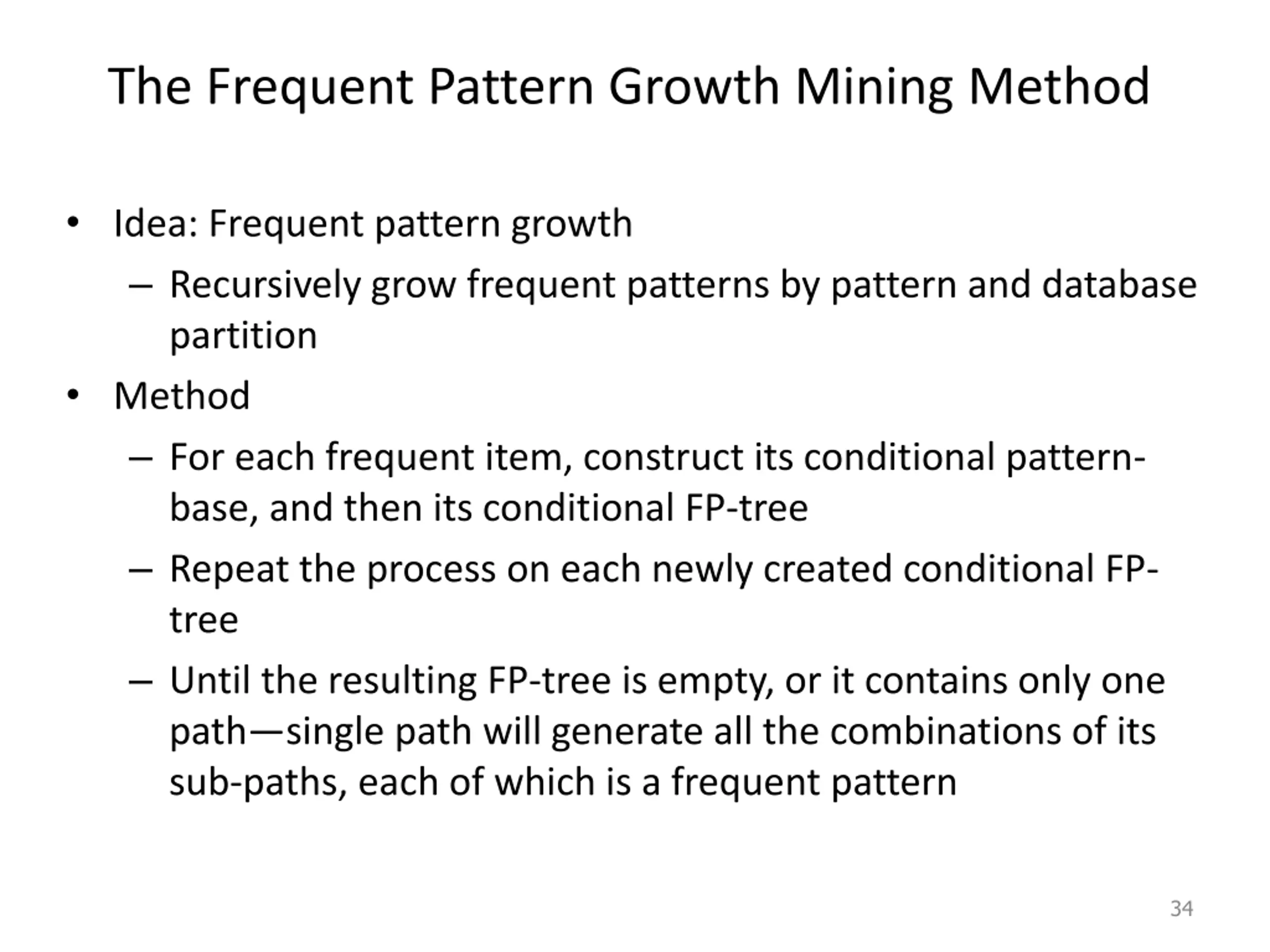 The Frequent Pattern Growth Mining Method Idea: Frequent pattern growth Recursively grow frequent patterns by pattern and database partition Method For each frequent item, construct its conditional pattern- base, and then its conditional FP-tree Repeat the process on each newly created conditional FP- tree Until the resulting FP-tree is empty, or it contains only one path single path will generate all the combinations of its sub-paths, each of which is a frequent pattern 34