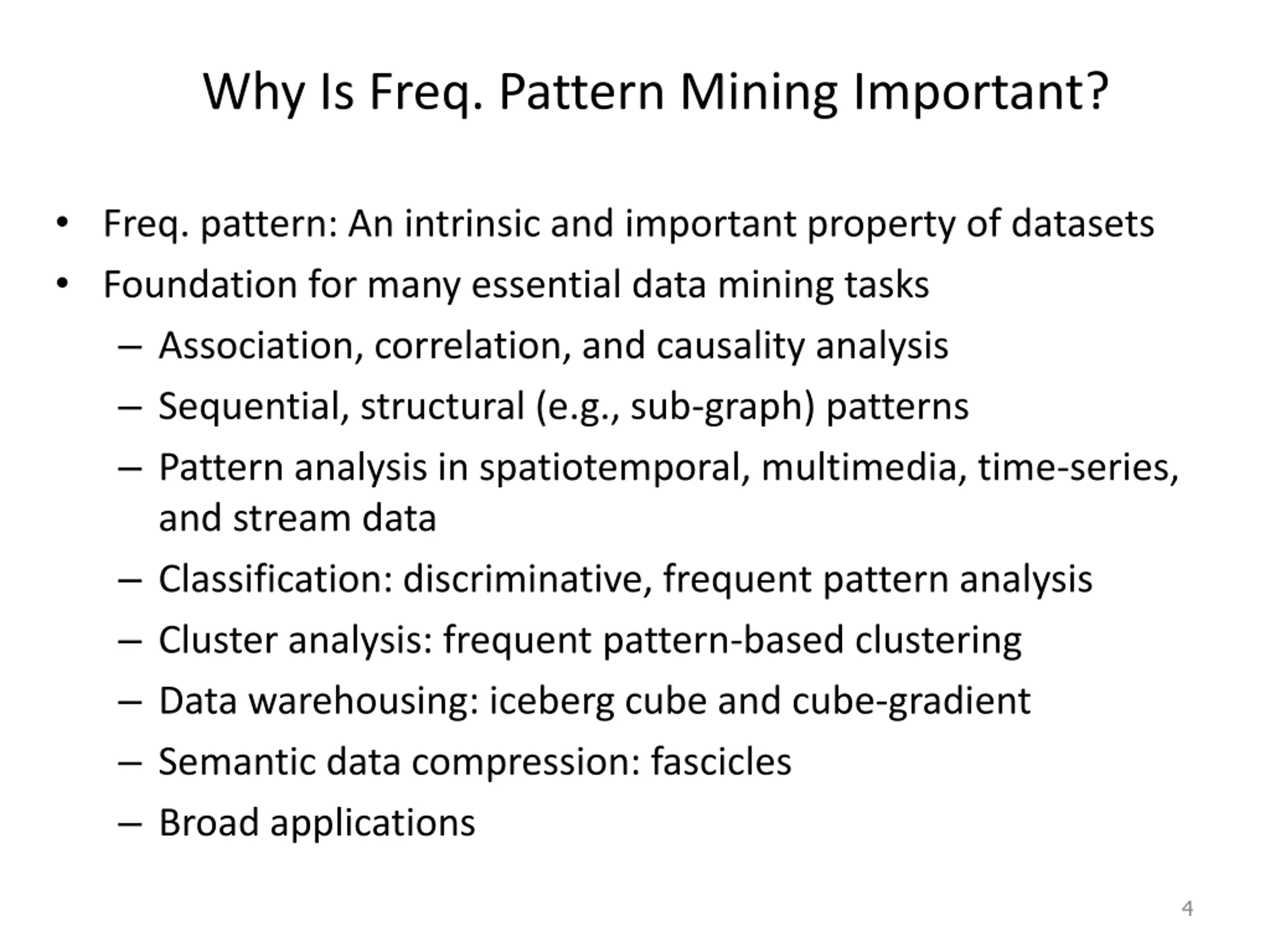 What Is Frequent Pattern Analysis? Frequent pattern: a pattern (a set of items, subsequences, substructures, etc.) that occurs frequently in a data set First proposed by Agrawal, Imielinski, and Swami [AIS93] in the context of frequent itemsets and association rule mining Motivation: Finding inherent regularities in data What products were often purchased together? Beer and diapers?! What are the subsequent purchases after buying a PC? What kinds of DNA are sensitive to this new drug? Can we automatically classify web documents? Applications Basket data analysis, cross-marketing, catalog design, sale campaign analysis, Web log (click stream) analysis, and DNA sequence analysis. 3