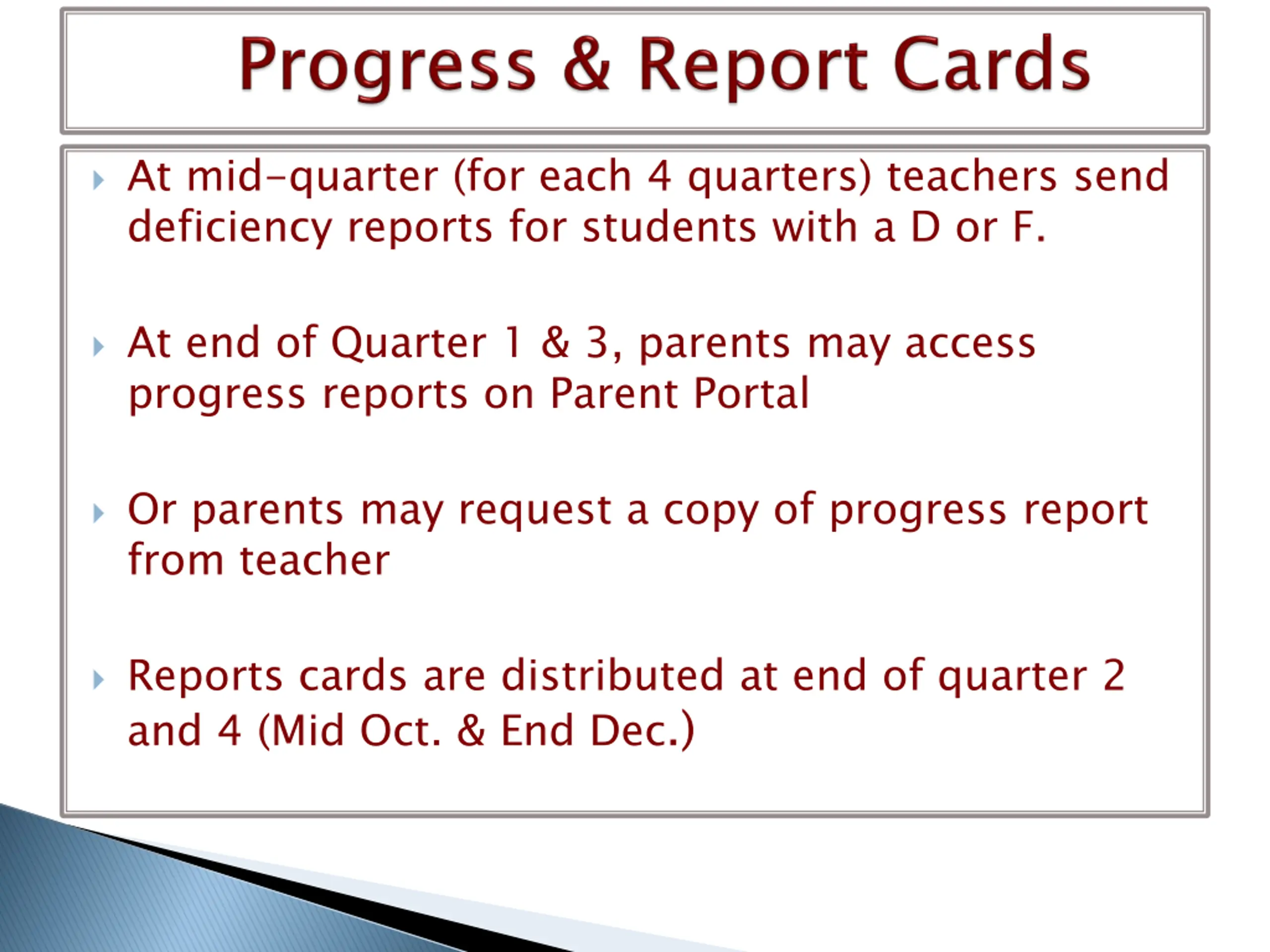 At mid-quarter (for each 4 quarters) teachers send deficiency reports for students with a D or F. At end of Quarter 1 & 3, parents may access progress reports on Parent Portal Or parents may request a copy of progress report from teacher Reports cards are distributed at end of quarter 2 and 4 (Mid Oct. & End Dec.)