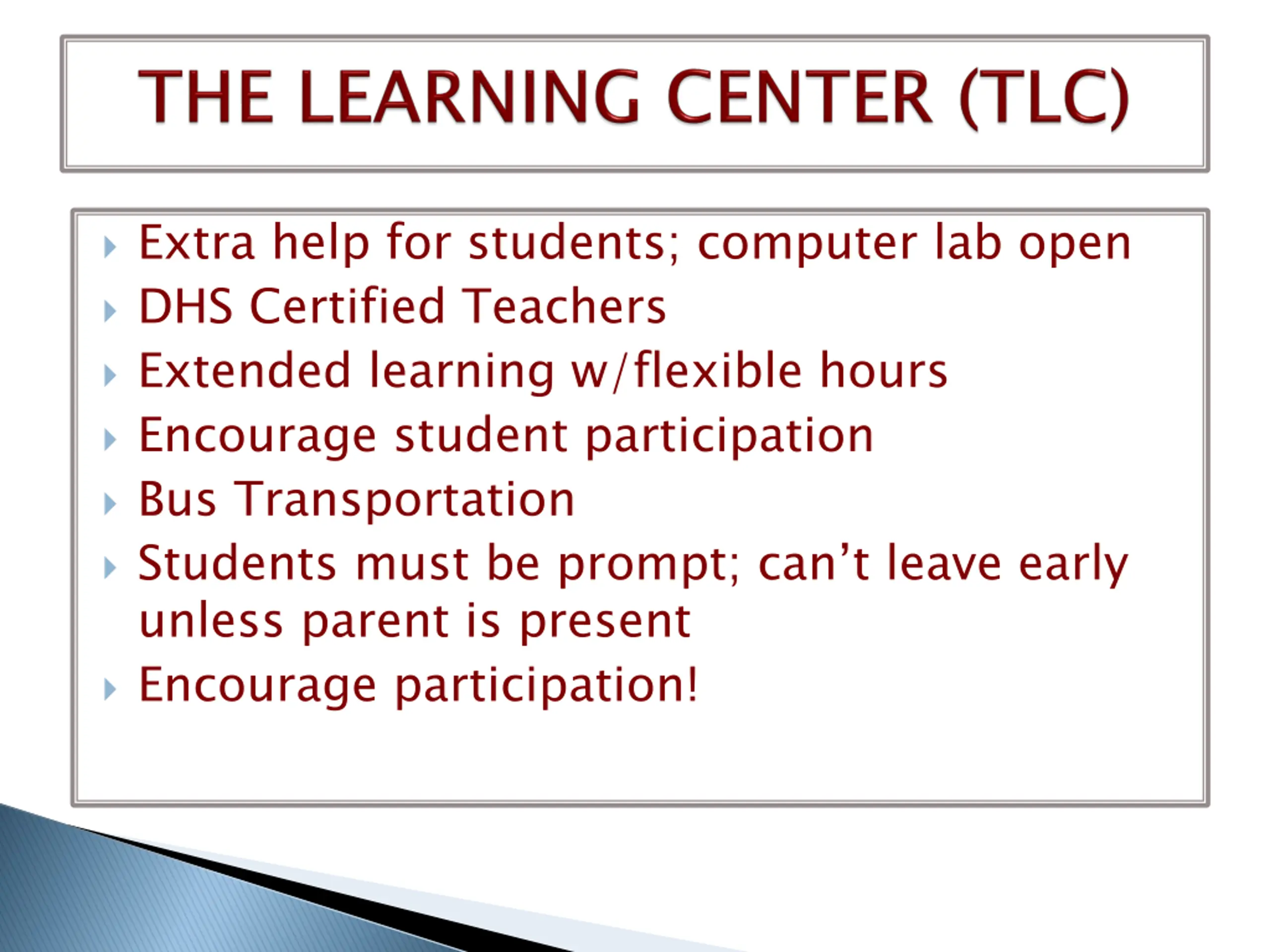 Extra help for students; computer lab open DHS Certified Teachers Extended learning w/flexible hours Encourage student participation Bus Transportation Students must be prompt; can t leave early unless parent is present Encourage participation!
