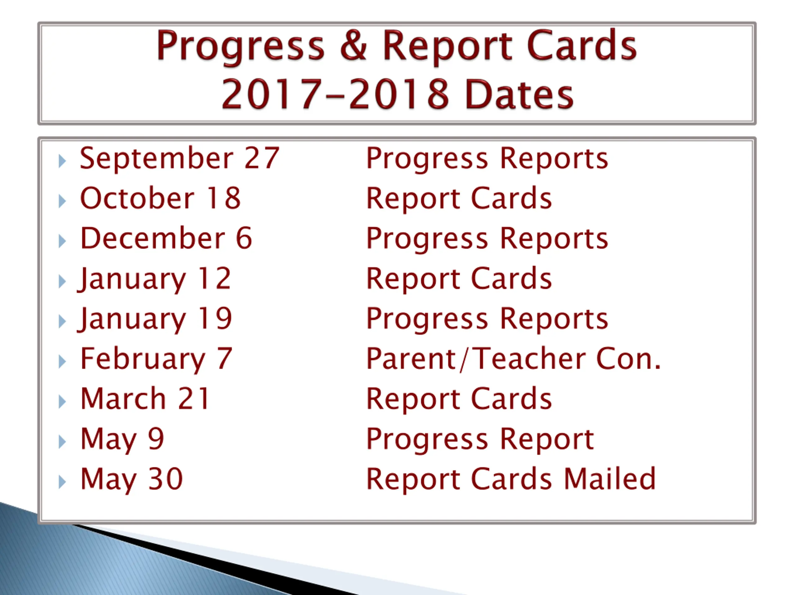 September 27 October 18 December 6 January 12 January 19 February 7 March 21 May 9 May 30 Progress Reports Report Cards Progress Reports Report Cards Progress Reports Parent/Teacher Con. Report Cards Progress Report Report Cards Mailed