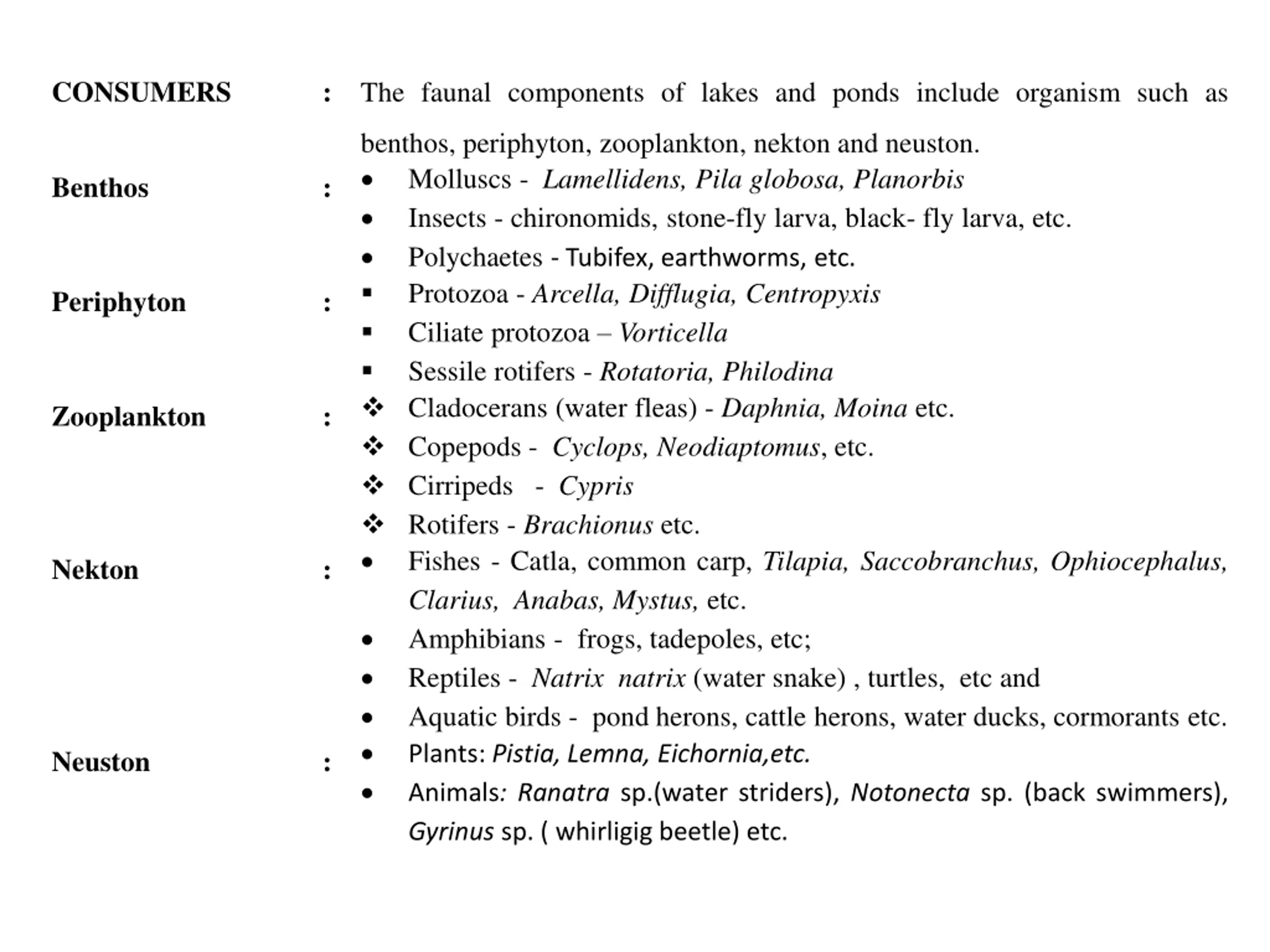 CONSUMERS : The faunal components of lakes and ponds include organism such as benthos, periphyton, zooplankton, nekton and neuston. Molluscs - Lamellidens, Pila globosa, Planorbis Insects - chironomids, stone-fly larva, black- fly larva, etc. Polychaetes - Tubifex, earthworms, etc. Protozoa - Arcella, Difflugia, Centropyxis Ciliate protozoa Vorticella Sessile rotifers - Rotatoria, Philodina Cladocerans (water fleas) - Daphnia, Moina etc. Copepods - Cyclops, Neodiaptomus, etc. Cirripeds - Cypris Rotifers - Brachionus etc. Fishes - Catla, common carp, Tilapia, Saccobranchus, Ophiocephalus, Clarius, Anabas, Mystus, etc. Amphibians - frogs, tadepoles, etc; Reptiles - Natrix natrix (water snake) , turtles, etc and Aquatic birds - pond herons, cattle herons, water ducks, cormorants etc. Plants: Pistia, Lemna, Eichornia,etc. Animals: Ranatra sp.(water striders), Notonecta sp. (back swimmers), Gyrinus sp. ( whirligig beetle) etc. Benthos : Periphyton : Zooplankton : Nekton : Neuston :
