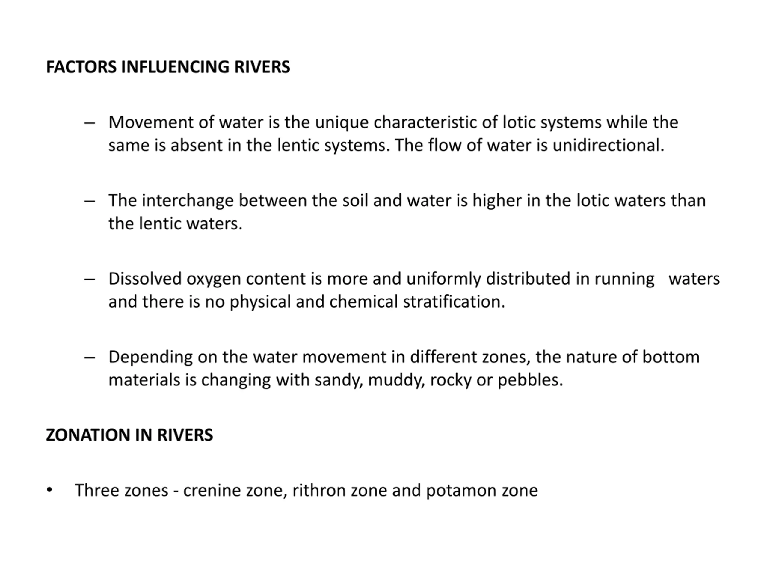FACTORS INFLUENCING RIVERS Movement of water is the unique characteristic of lotic systems while the same is absent in the lentic systems. The flow of water is unidirectional. The interchange between the soil and water is higher in the lotic waters than the lentic waters. Dissolved oxygen content is more and uniformly distributed in running waters and there is no physical and chemical stratification. Depending on the water movement in different zones, the nature of bottom materials is changing with sandy, muddy, rocky or pebbles. ZONATION IN RIVERS Three zones - crenine zone, rithron zone and potamon zone