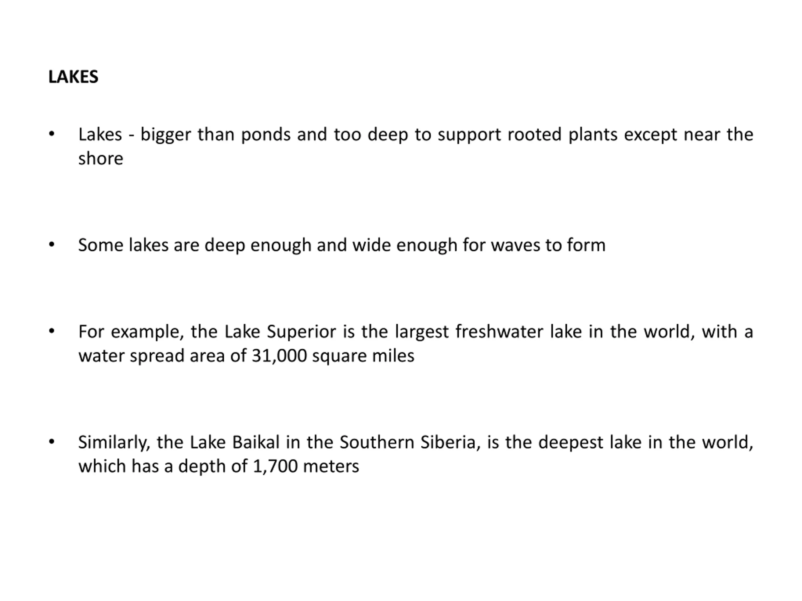 LAKES Lakes - bigger than ponds and too deep to support rooted plants except near the shore Some lakes are deep enough and wide enough for waves to form For example, the Lake Superior is the largest freshwater lake in the world, with a water spread area of 31,000 square miles Similarly, the Lake Baikal in the Southern Siberia, is the deepest lake in the world, which has a depth of 1,700 meters