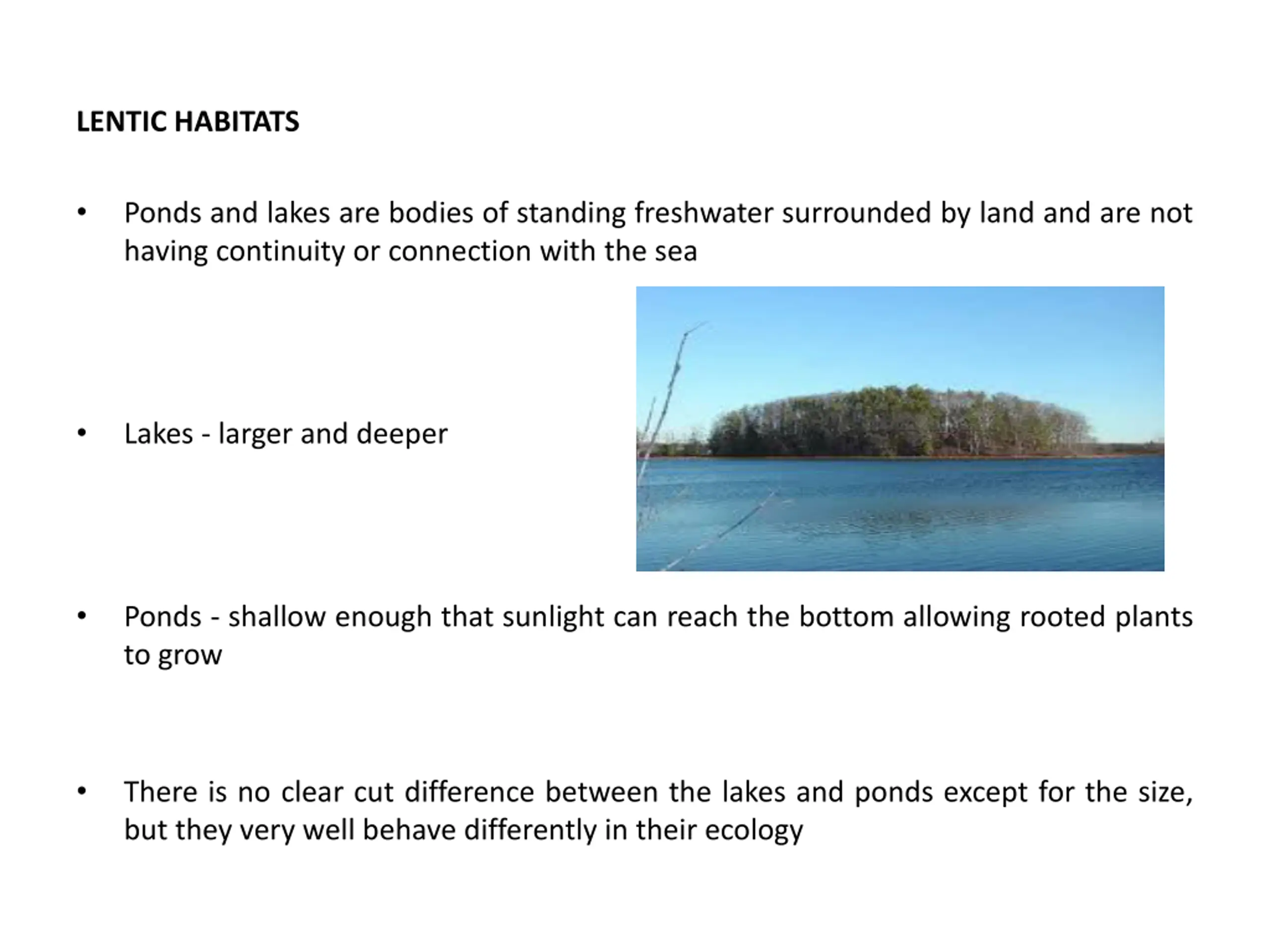 LENTIC HABITATS Ponds and lakes are bodies of standing freshwater surrounded by land and are not having continuity or connection with the sea Lakes - larger and deeper Ponds - shallow enough that sunlight can reach the bottom allowing rooted plants to grow There is no clear cut difference between the lakes and ponds except for the size, but they very well behave differently in their ecology