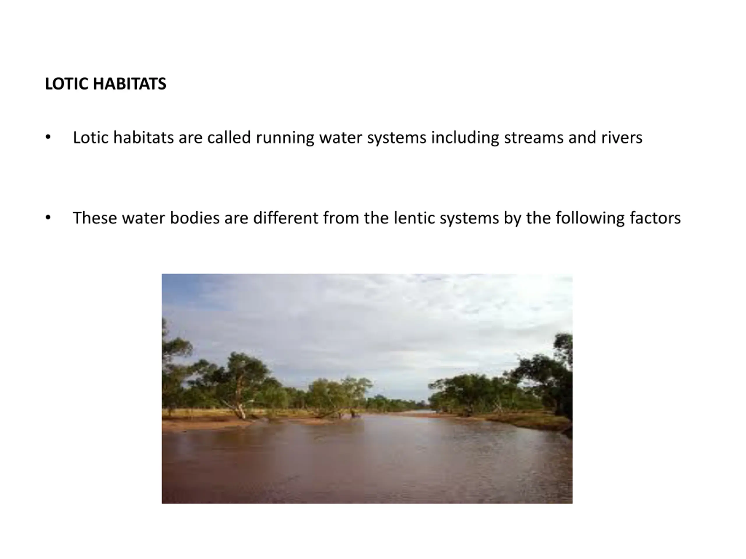 LOTIC HABITATS Lotic habitats are called running water systems including streams and rivers These water bodies are different from the lentic systems by the following factors