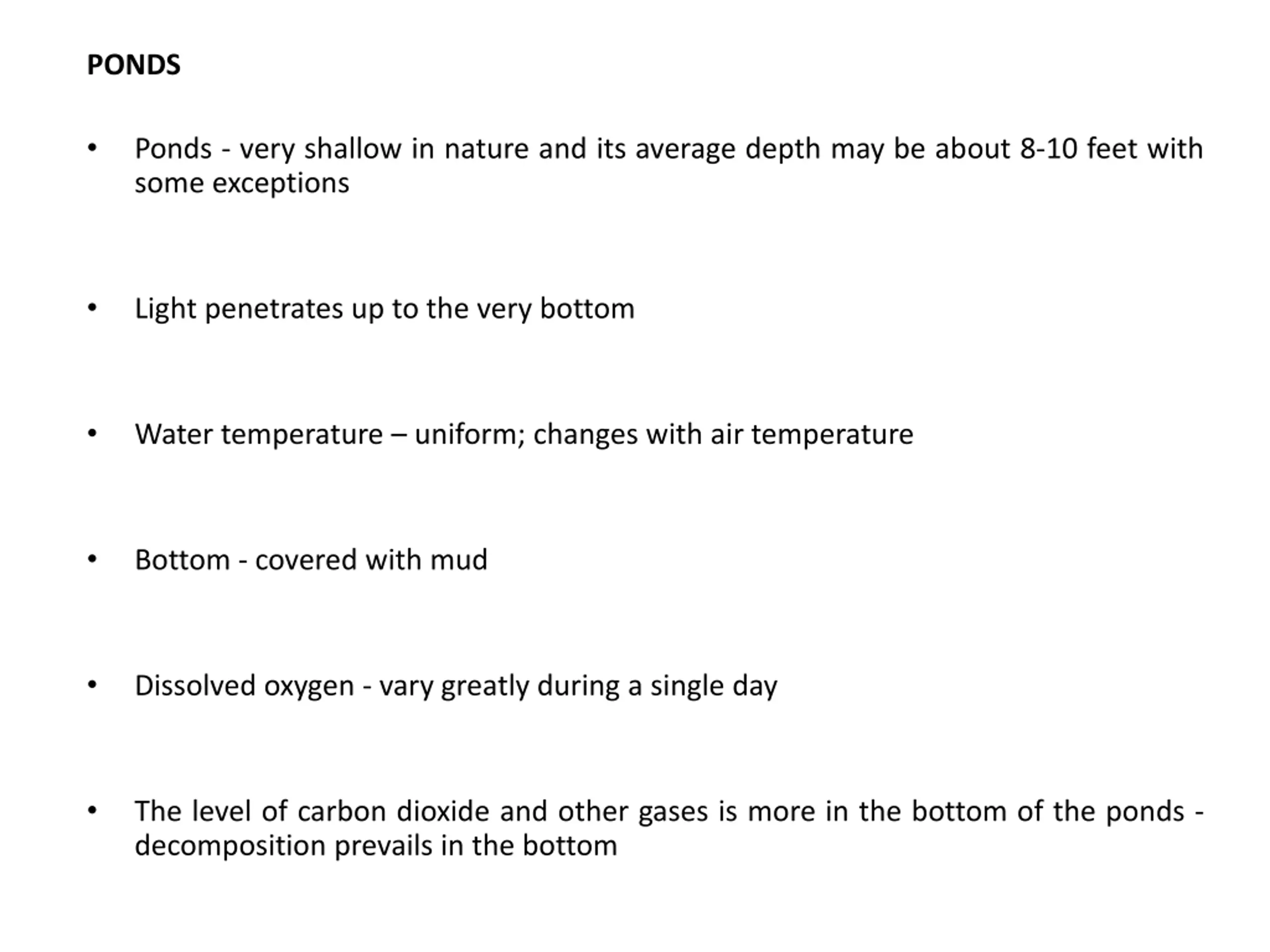 PONDS Ponds - very shallow in nature and its average depth may be about 8-10 feet with some exceptions Light penetrates up to the very bottom Water temperature uniform; changes with air temperature Bottom - covered with mud Dissolved oxygen - vary greatly during a single day The level of carbon dioxide and other gases is more in the bottom of the ponds - decomposition prevails in the bottom
