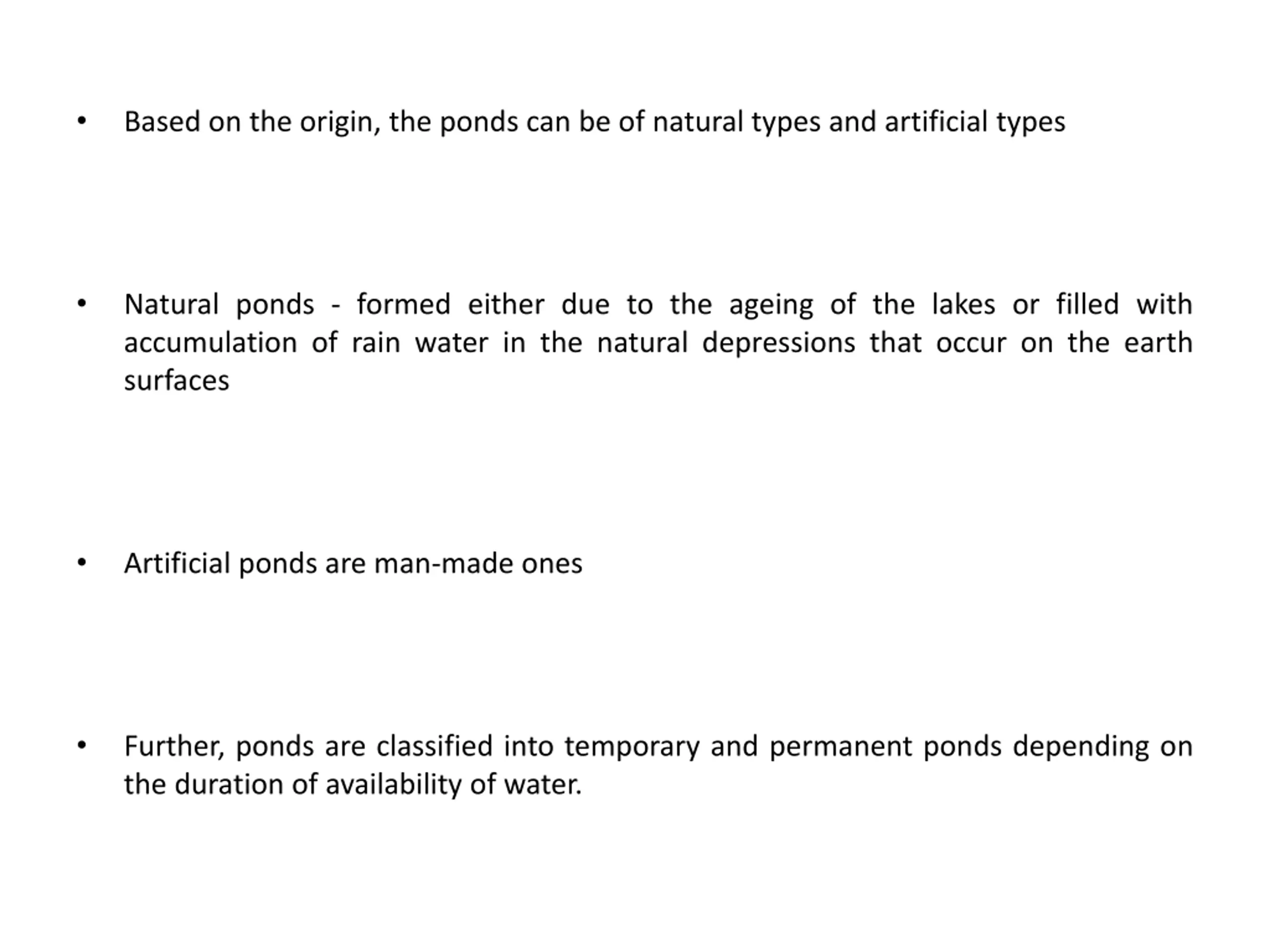 Based on the origin, the ponds can be of natural types and artificial types Natural ponds - formed either due to the ageing of the lakes or filled with accumulation of rain water in the natural depressions that occur on the earth surfaces Artificial ponds are man-made ones Further, ponds are classified into temporary and permanent ponds depending on the duration of availability of water.