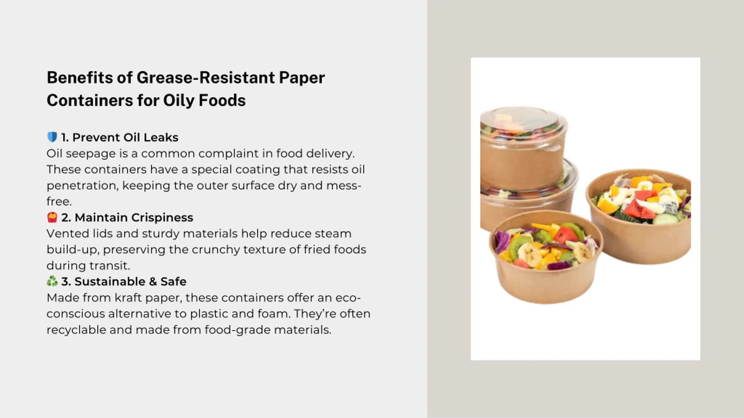 Benefits of Grease-Resistant Paper Containers for Oily Foods ? 1. Prevent Oil Leaks Oil seepage is a common complaint in food delivery. These containers have a special coating that resists oil penetration, keeping the outer surface dry and mess- free. ? 2. Maintain Crispiness Vented lids and sturdy materials help reduce steam build-up, preserving the crunchy texture of fried foods during transit. 3. Sustainable & Safe Made from kraft paper, these containers offer an eco- conscious alternative to plastic and foam. They re often recyclable and made from food-grade materials.