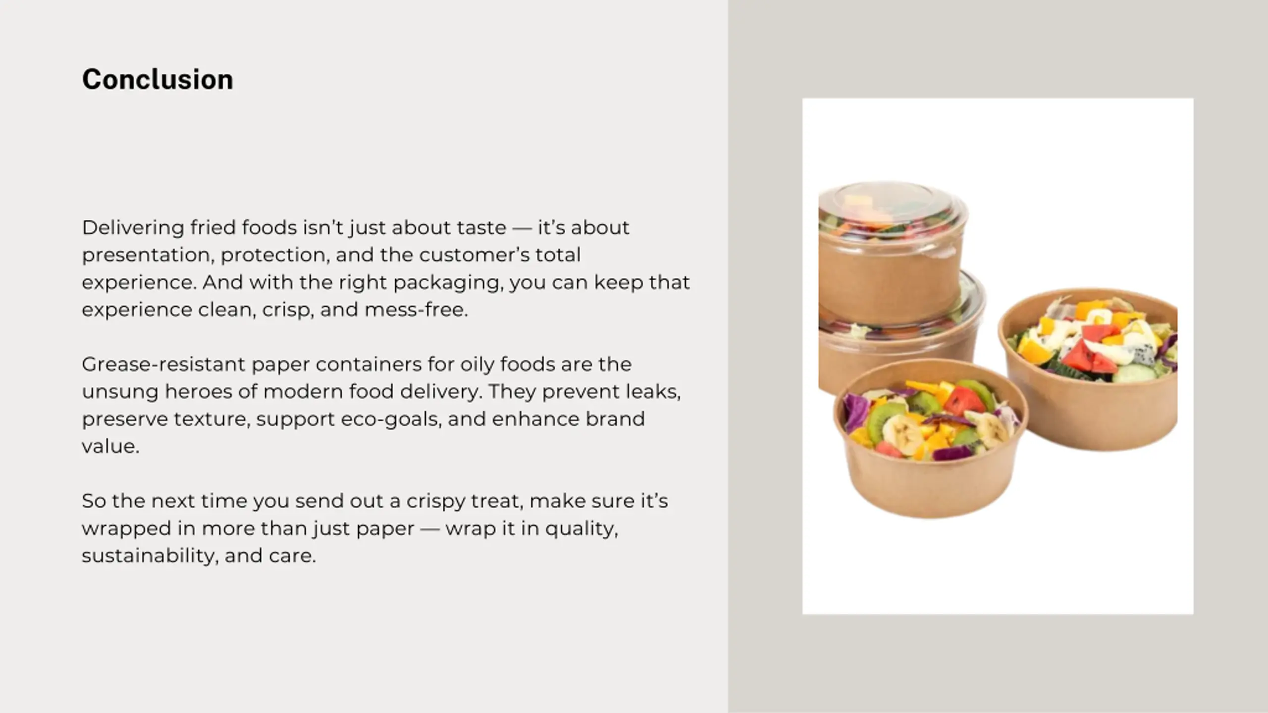 Conclusion Delivering fried foods isn t just about taste it s about presentation, protection, and the customer s total experience. And with the right packaging, you can keep that experience clean, crisp, and mess-free. Grease-resistant paper containers for oily foods are the unsung heroes of modern food delivery. They prevent leaks, preserve texture, support eco-goals, and enhance brand value. So the next time you send out a crispy treat, make sure it s wrapped in more than just paper wrap it in quality, sustainability, and care.