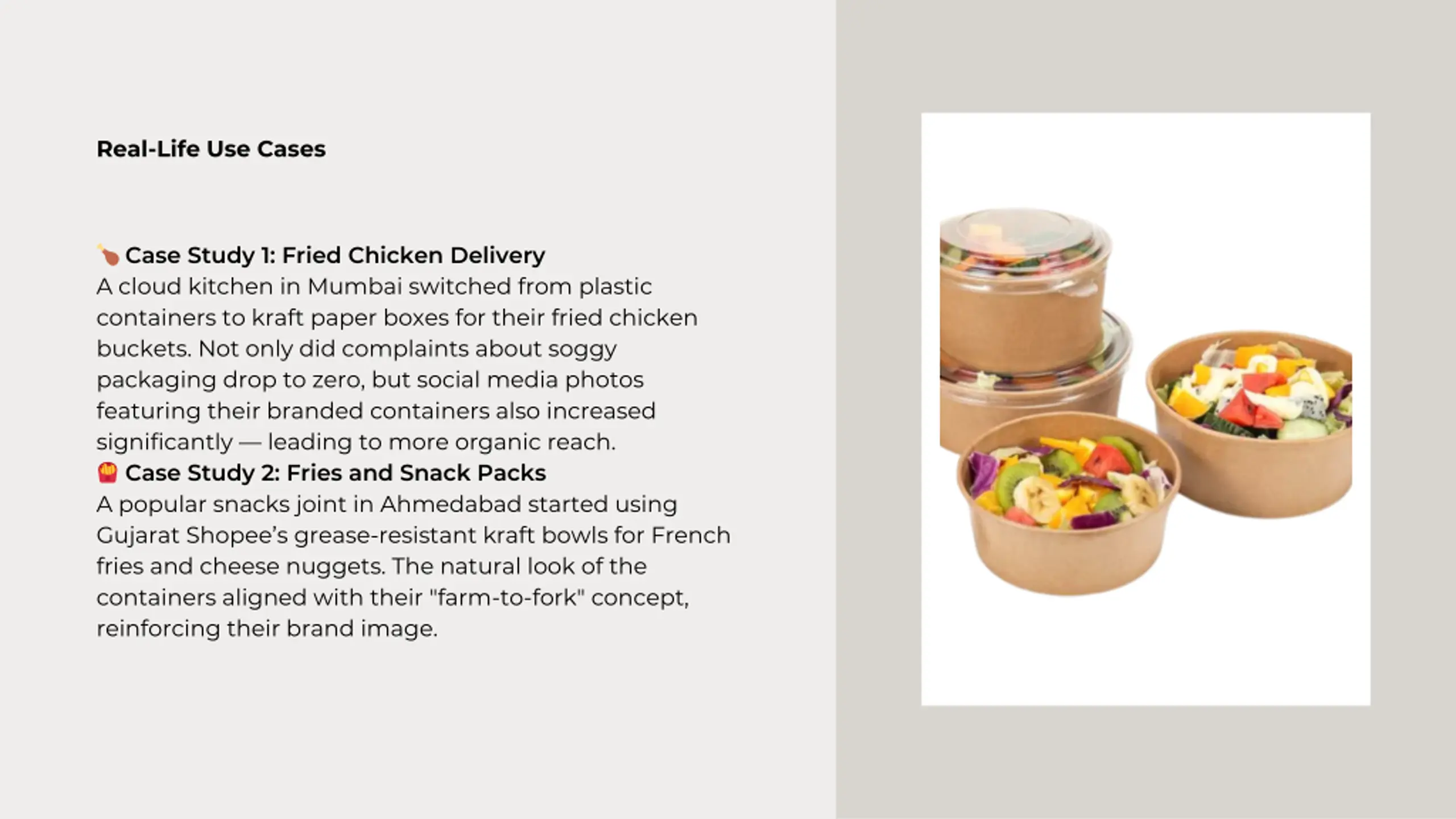 Real-Life Use Cases ? Case Study 1: Fried Chicken Delivery A cloud kitchen in Mumbai switched from plastic containers to kraft paper boxes for their fried chicken buckets. Not only did complaints about soggy packaging drop to zero, but social media photos featuring their branded containers also increased significantly leading to more organic reach. ? Case Study 2: Fries and Snack Packs A popular snacks joint in Ahmedabad started using Gujarat Shopee s grease-resistant kraft bowls for French fries and cheese nuggets. The natural look of the containers aligned with their "farm-to-fork" concept, reinforcing their brand image.