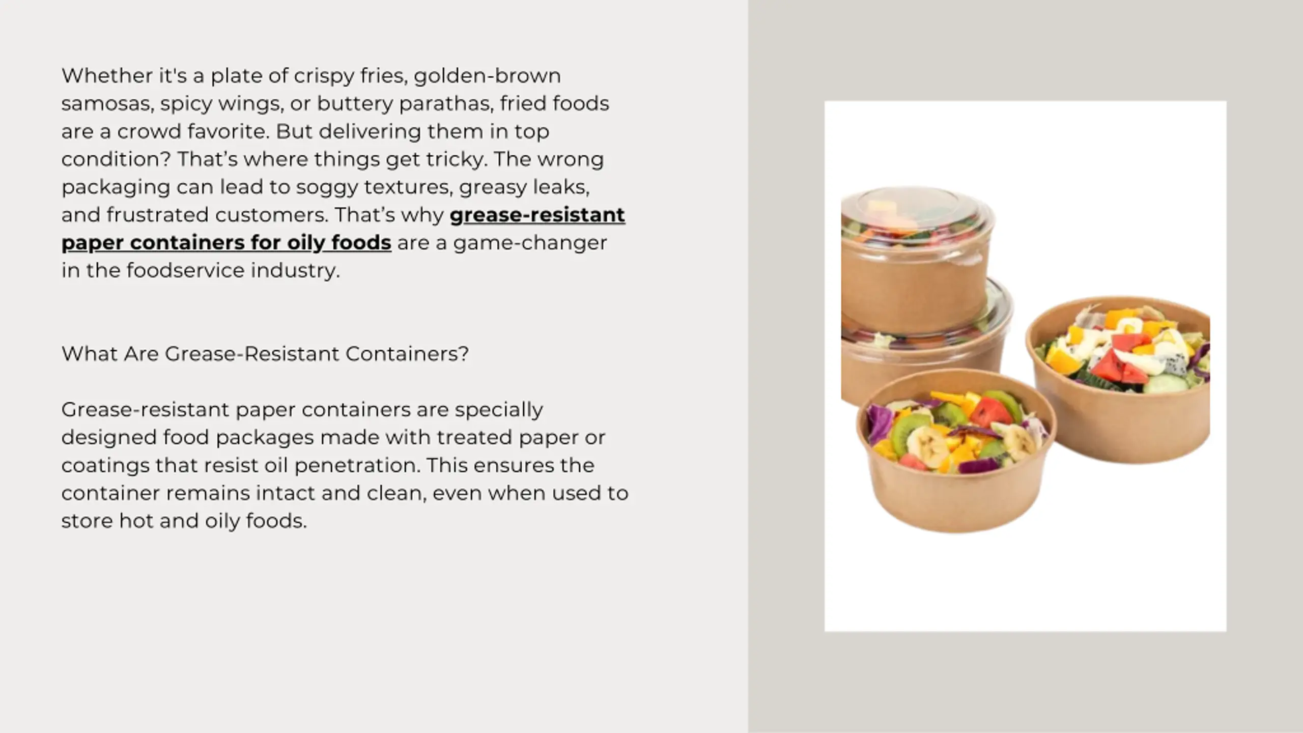 Whether it's a plate of crispy fries, golden-brown samosas, spicy wings, or buttery parathas, fried foods are a crowd favorite. But delivering them in top condition? That s where things get tricky. The wrong packaging can lead to soggy textures, greasy leaks, and frustrated customers. That s why grease-resistant paper containers for oily foods are a game-changer in the foodservice industry. What Are Grease-Resistant Containers? Grease-resistant paper containers are specially designed food packages made with treated paper or coatings that resist oil penetration. This ensures the container remains intact and clean, even when used to store hot and oily foods.