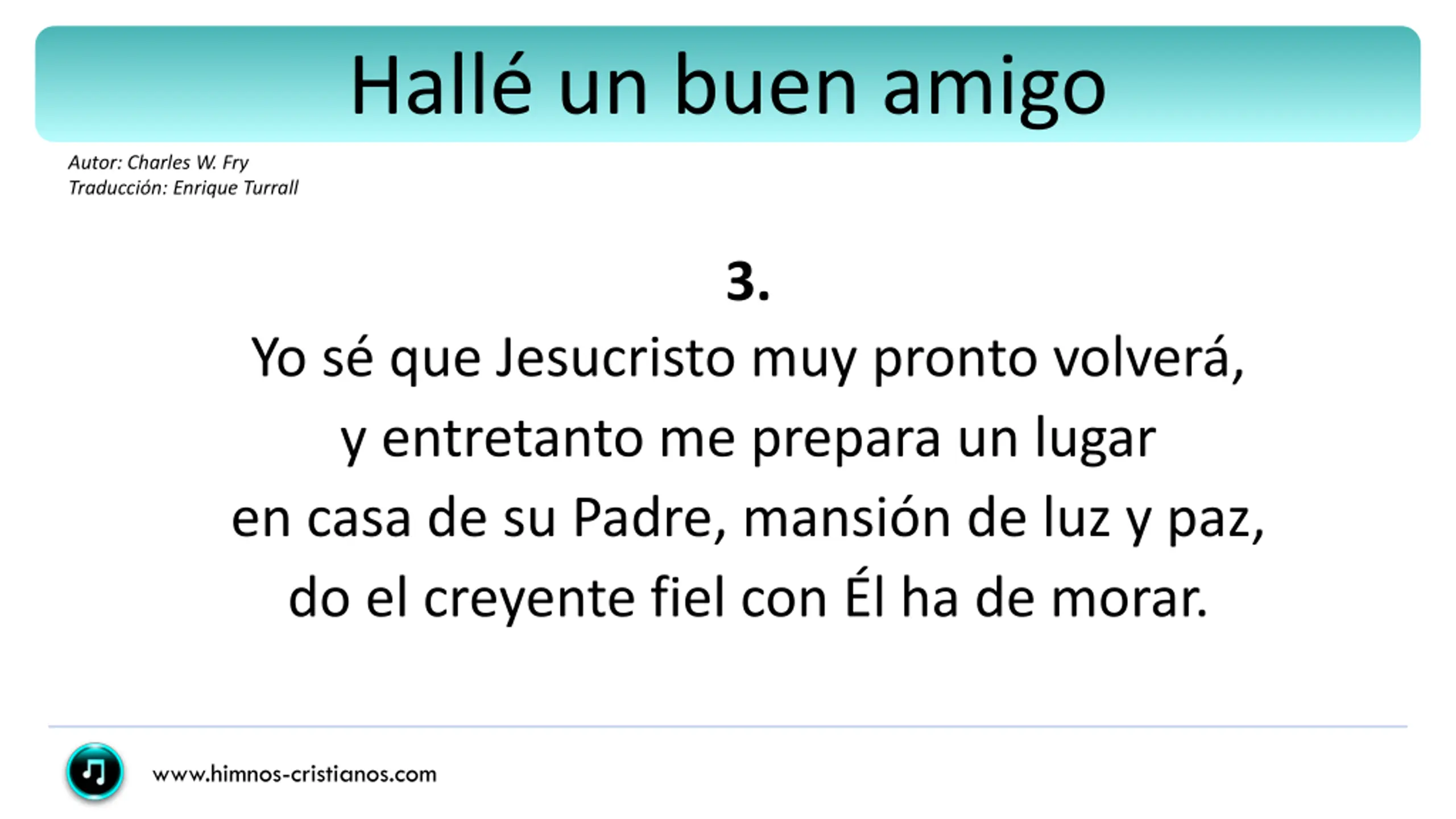 Hall un buen amigo Autor: Charles W. Fry Traducci n: Enrique Turrall 3. Yo s que Jesucristo muy pronto volver , y entretanto me prepara un lugar en casa de su Padre, mansi n de luz y paz, do el creyente fiel con l ha de morar. www.himnos-cristianos.com