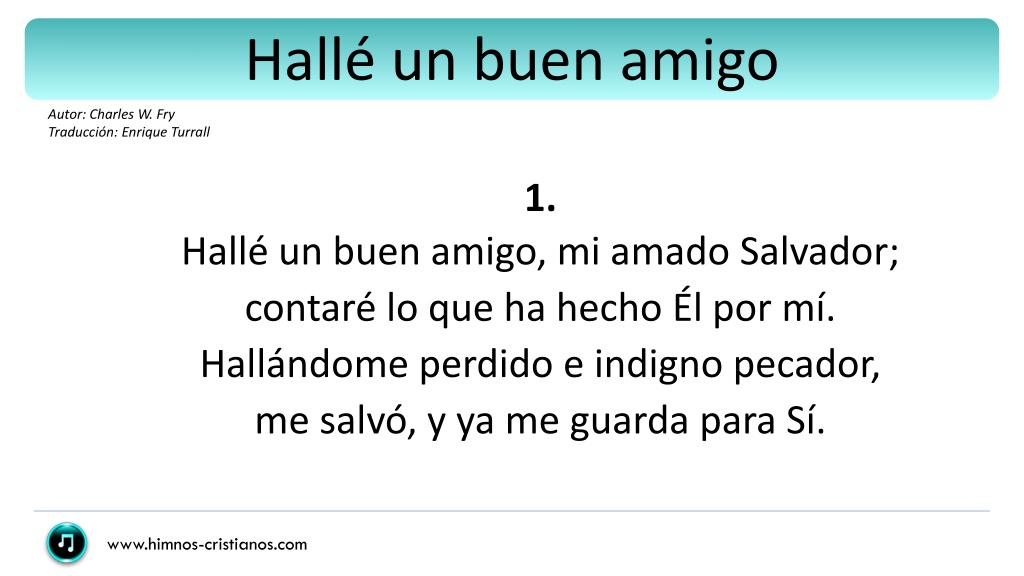 Hall un buen amigo Autor: Charles W. Fry Traducci n: Enrique Turrall 1. Hall un buen amigo, mi amado Salvador; contar lo que ha hecho l por m . Hall ndome perdido e indigno pecador, me salv , y ya me guarda para S . www.himnos-cristianos.com