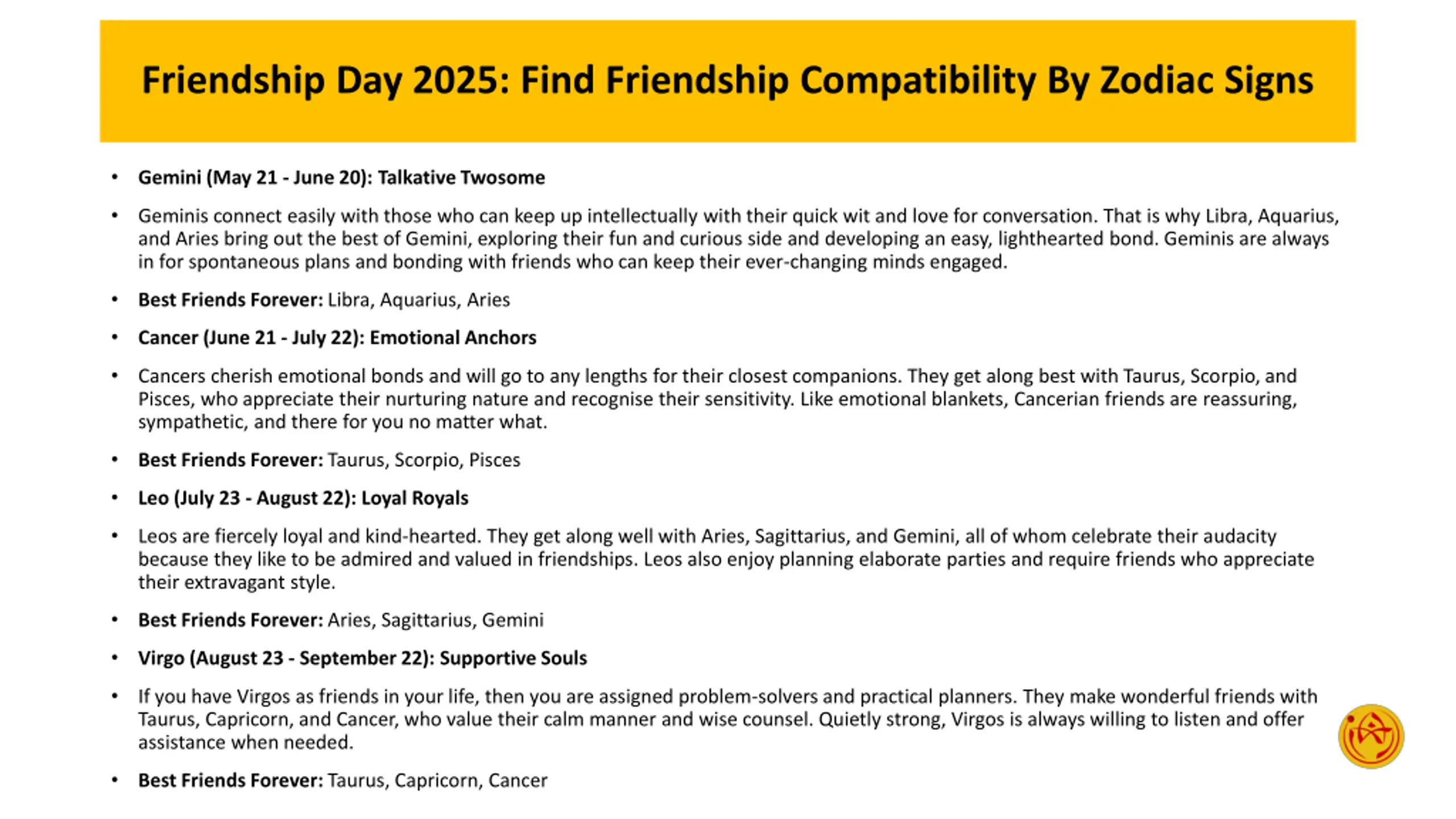 Friendship Day 2025: Find Friendship Compatibility By Zodiac Signs Gemini (May 21 - June 20): Talkative Twosome Geminis connect easily with those who can keep up intellectually with their quick wit and love for conversation. That is why Libra, Aquarius, and Aries bring out the best of Gemini, exploring their fun and curious side and developing an easy, lighthearted bond. Geminis are always in for spontaneous plans and bonding with friends who can keep their ever-changing minds engaged. Best Friends Forever:Libra, Aquarius, Aries Cancer (June 21 - July 22): Emotional Anchors Cancers cherish emotional bonds and will go to any lengths for their closest companions. They get along best with Taurus, Scorpio, and Pisces, who appreciate their nurturing nature and recognise their sensitivity. Like emotional blankets, Cancerian friends are reassuring, sympathetic, and there for you no matter what. Best Friends Forever:Taurus, Scorpio, Pisces Leo (July 23 - August 22): Loyal Royals Leos are fiercely loyal and kind-hearted. They get along well with Aries, Sagittarius, and Gemini, all of whom celebrate their audacity because they like to be admired and valued in friendships. Leos also enjoy planning elaborate parties and require friends who appreciate their extravagant style. Best Friends Forever:Aries, Sagittarius, Gemini Virgo (August 23 - September 22): Supportive Souls If you have Virgos as friends in your life, then you are assigned problem-solvers and practical planners. They make wonderful friends with Taurus, Capricorn, and Cancer, who value their calm manner and wise counsel. Quietly strong, Virgos is always willing to listen and offer assistance when needed. Best Friends Forever:Taurus, Capricorn, Cancer