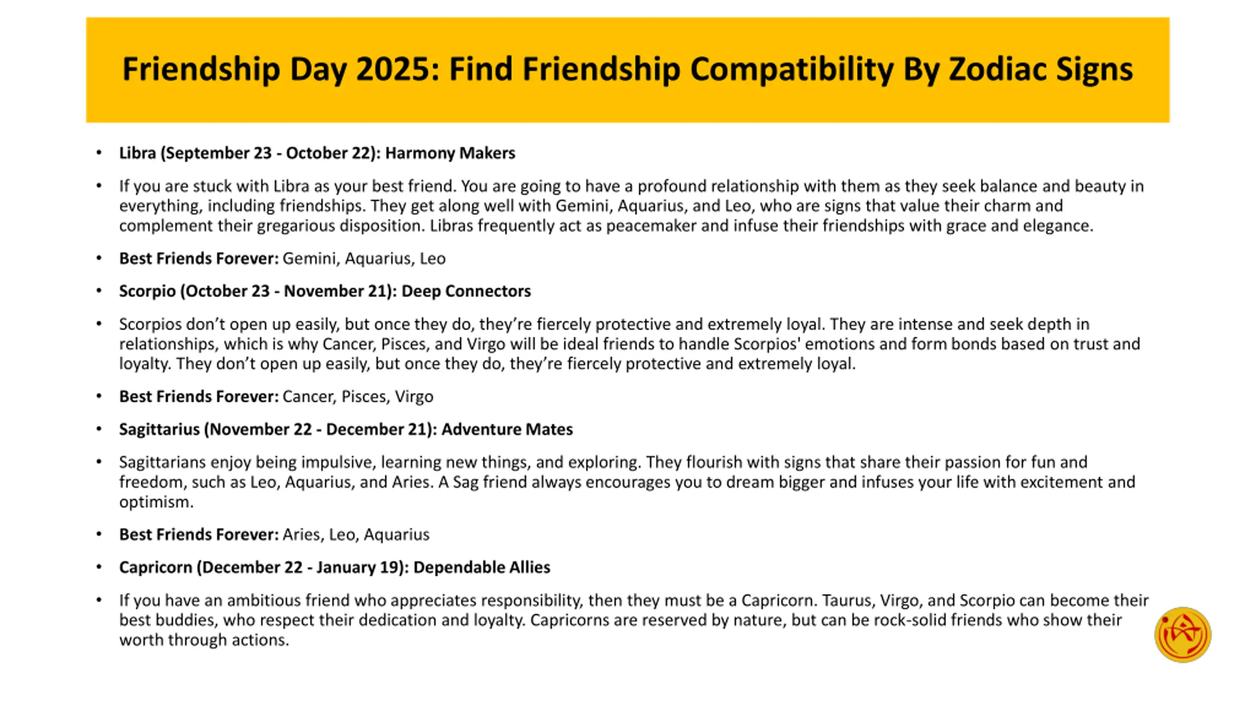 Friendship Day 2025: Find Friendship Compatibility By Zodiac Signs Libra (September 23 - October 22): Harmony Makers If you are stuck with Libra as your best friend. You are going to have a profound relationship with them as they seek balance and beauty in everything, including friendships. They get along well with Gemini, Aquarius, and Leo, who are signs that value their charm and complement their gregarious disposition. Libras frequently act as peacemaker and infuse their friendships with grace and elegance. Best Friends Forever:Gemini, Aquarius, Leo Scorpio (October 23 - November 21): Deep Connectors Scorpios don t open up easily, but once they do, they re fiercely protective and extremely loyal. They are intense and seek depth in relationships, which is why Cancer, Pisces, and Virgo will be ideal friends to handle Scorpios' emotions and form bonds based on trust and loyalty. They don t open up easily, but once they do, they re fiercely protective and extremely loyal. Best Friends Forever:Cancer, Pisces, Virgo Sagittarius (November 22 - December 21): Adventure Mates Sagittarians enjoy being impulsive, learning new things, and exploring. They flourish with signs that share their passion for fun and freedom, such as Leo, Aquarius, and Aries. A Sag friend always encourages you to dream bigger and infuses your life with excitement and optimism. Best Friends Forever:Aries, Leo, Aquarius Capricorn (December 22 - January 19): Dependable Allies If you have an ambitious friend who appreciates responsibility, then they must be a Capricorn. Taurus, Virgo, and Scorpio can become their best buddies, who respect their dedication and loyalty. Capricorns are reserved by nature, but can be rock-solid friends who show their worth through actions.
