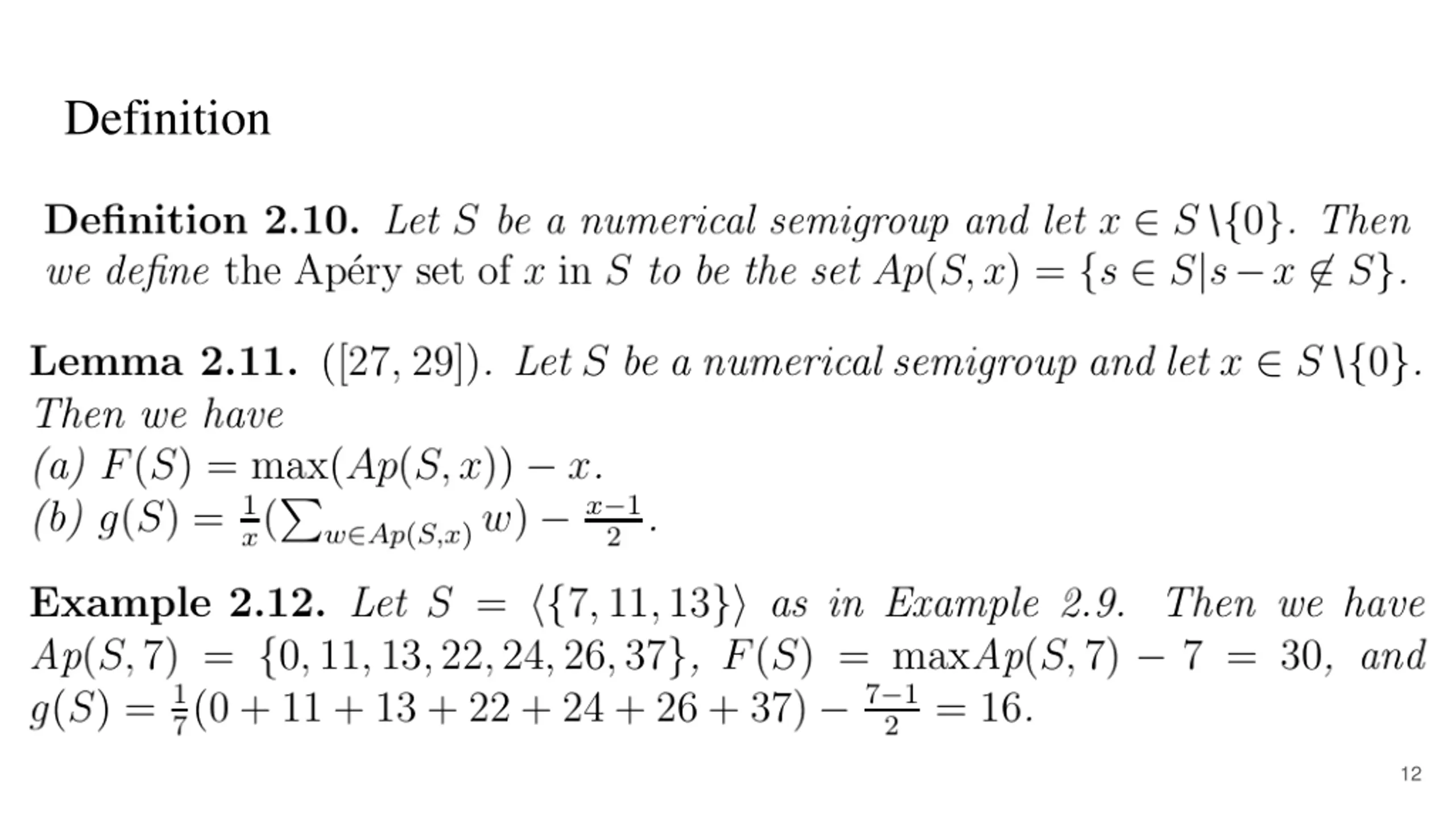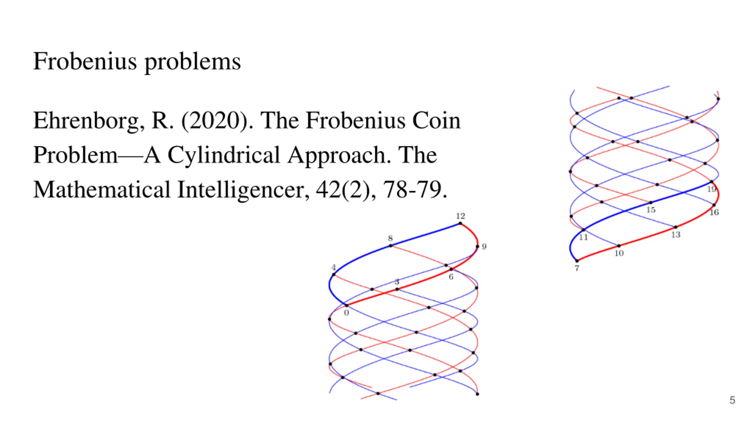 Frobenius problems Ehrenborg, R. (2020). The Frobenius Coin Problem A Cylindrical Approach. The Mathematical Intelligencer, 42(2), 78-79. 5