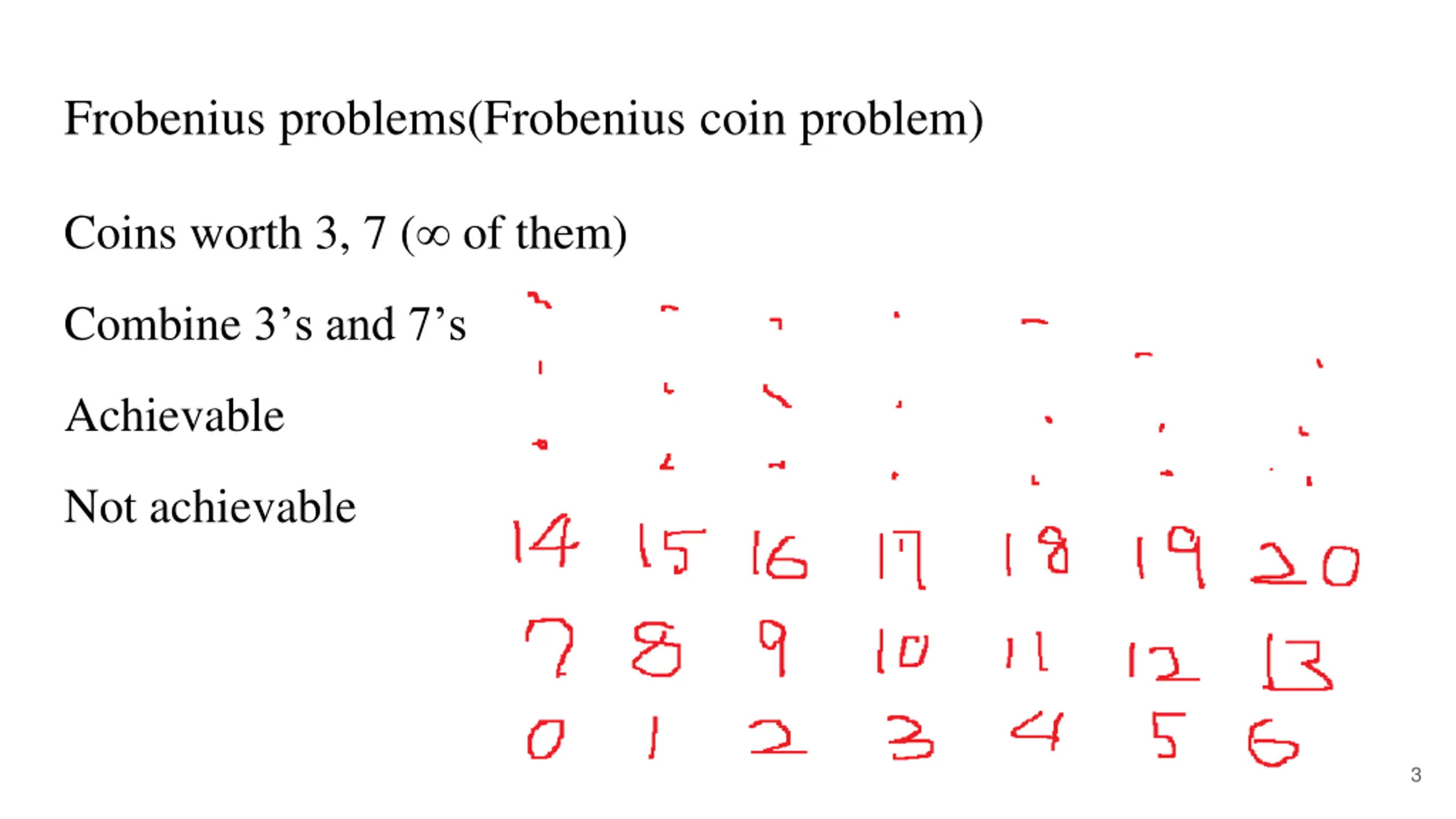 Frobenius problems(Frobenius coin problem) Coins worth 3, 7 ( of them) Combine 3 s and 7 s Achievable Not achievable 3