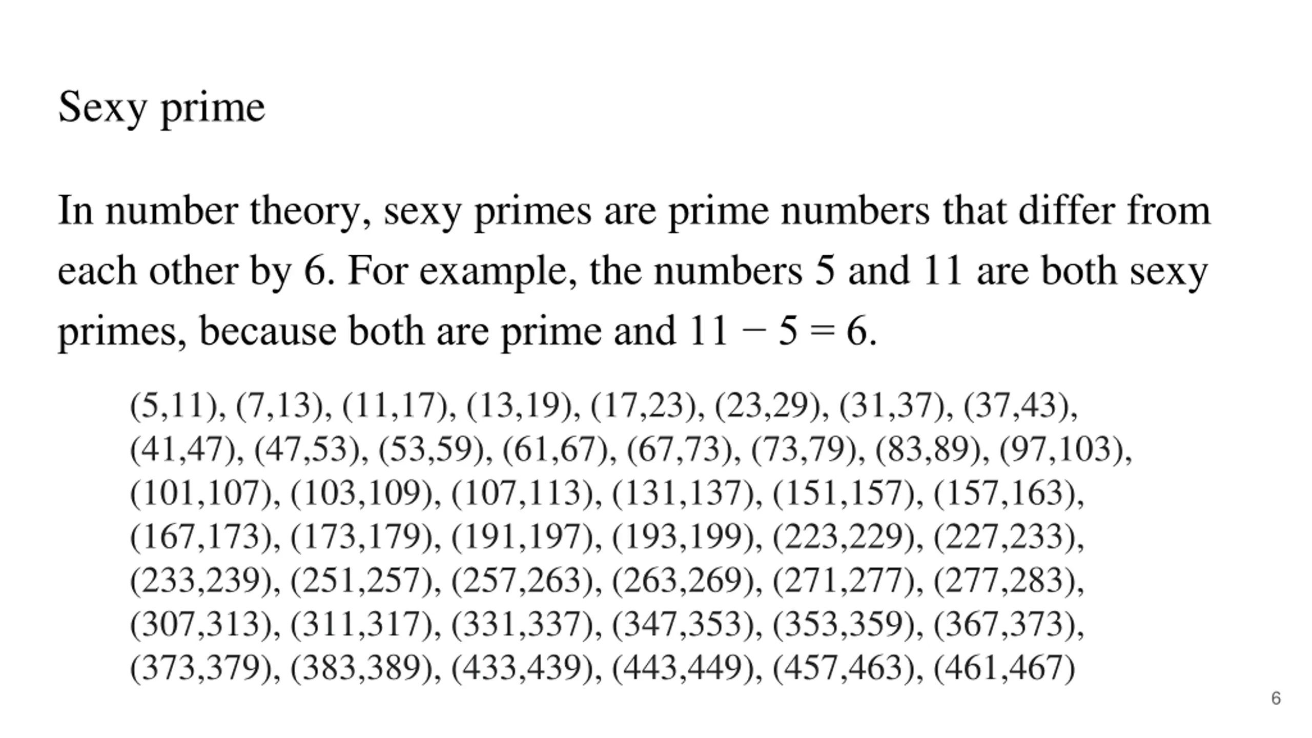 Sexy prime In number theory, sexy primes are prime numbers that differ from each other by 6. For example, the numbers 5 and 11 are both sexy primes, because both are prime and 11 5 = 6. (5,11), (7,13), (11,17), (13,19), (17,23), (23,29), (31,37), (37,43), (41,47), (47,53), (53,59), (61,67), (67,73), (73,79), (83,89), (97,103), (101,107), (103,109), (107,113), (131,137), (151,157), (157,163), (167,173), (173,179), (191,197), (193,199), (223,229), (227,233), (233,239), (251,257), (257,263), (263,269), (271,277), (277,283), (307,313), (311,317), (331,337), (347,353), (353,359), (367,373), (373,379), (383,389), (433,439), (443,449), (457,463), (461,467) 6