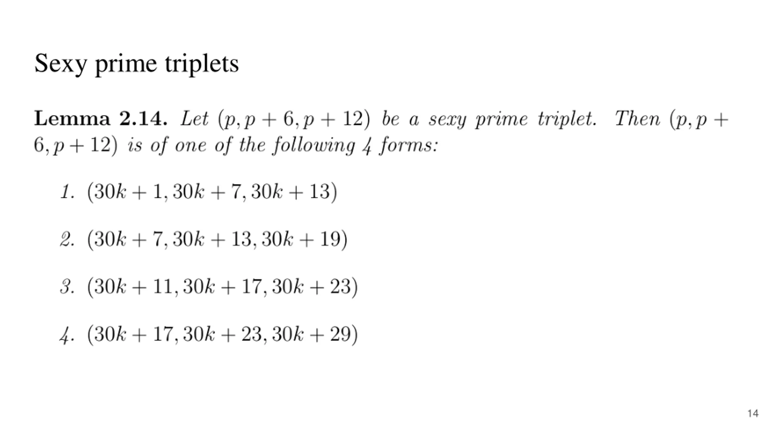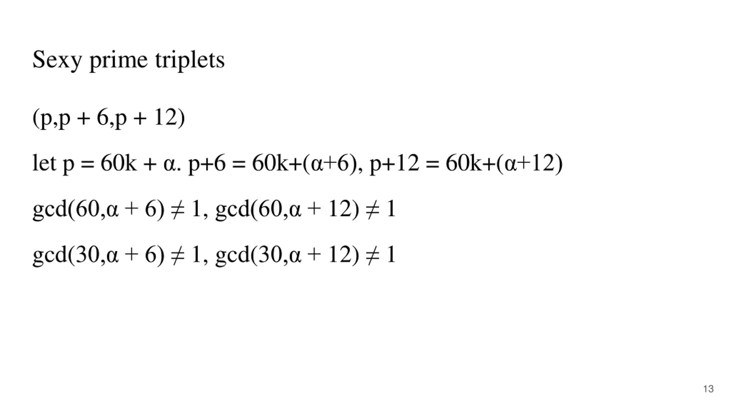 Sexy prime triplets (p,p + 6,p + 12) let p = 60k + . p+6 = 60k+( +6), p+12 = 60k+( +12) gcd(60, + 6) 1, gcd(60, + 12) 1 gcd(30, + 6) 1, gcd(30, + 12) 1 13