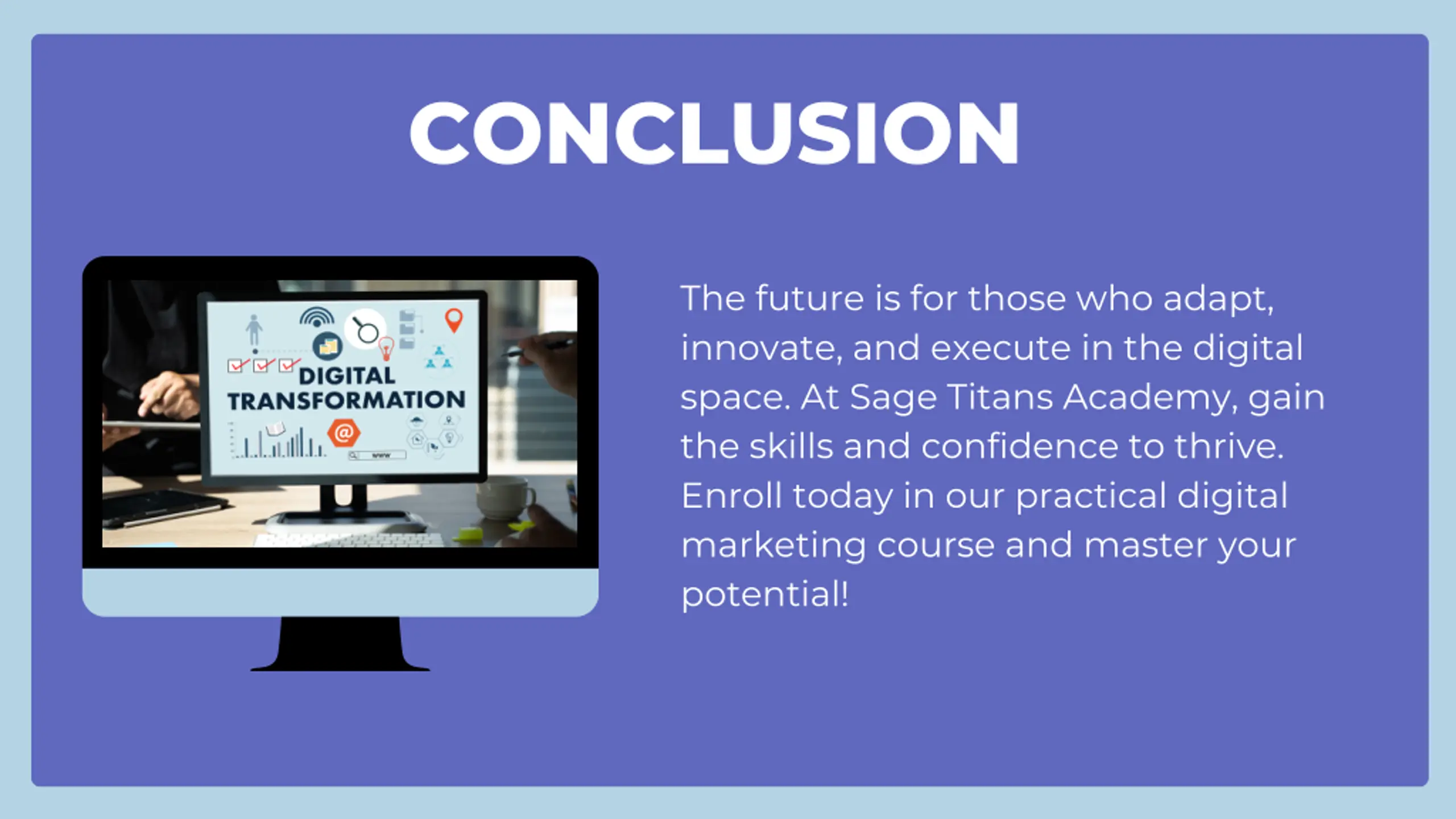 CONCLUSION The future is for those who adapt, innovate, and execute in the digital space. At Sage Titans Academy, gain the skills and confidence to thrive. Enroll today in our practical digital marketing course and master your potential!
