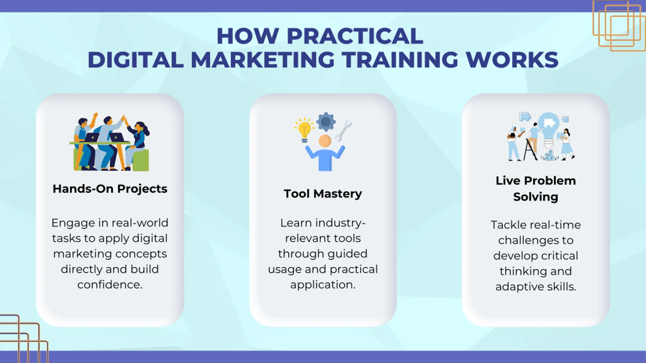 HOW PRACTICAL DIGITAL MARKETING TRAINING WORKS Live Problem Solving Hands-On Projects Tool Mastery Engage in real-world tasks to apply digital marketing concepts directly and build confidence. Learn industry- relevant tools through guided usage and practical application. Tackle real-time challenges to develop critical thinking and adaptive skills.